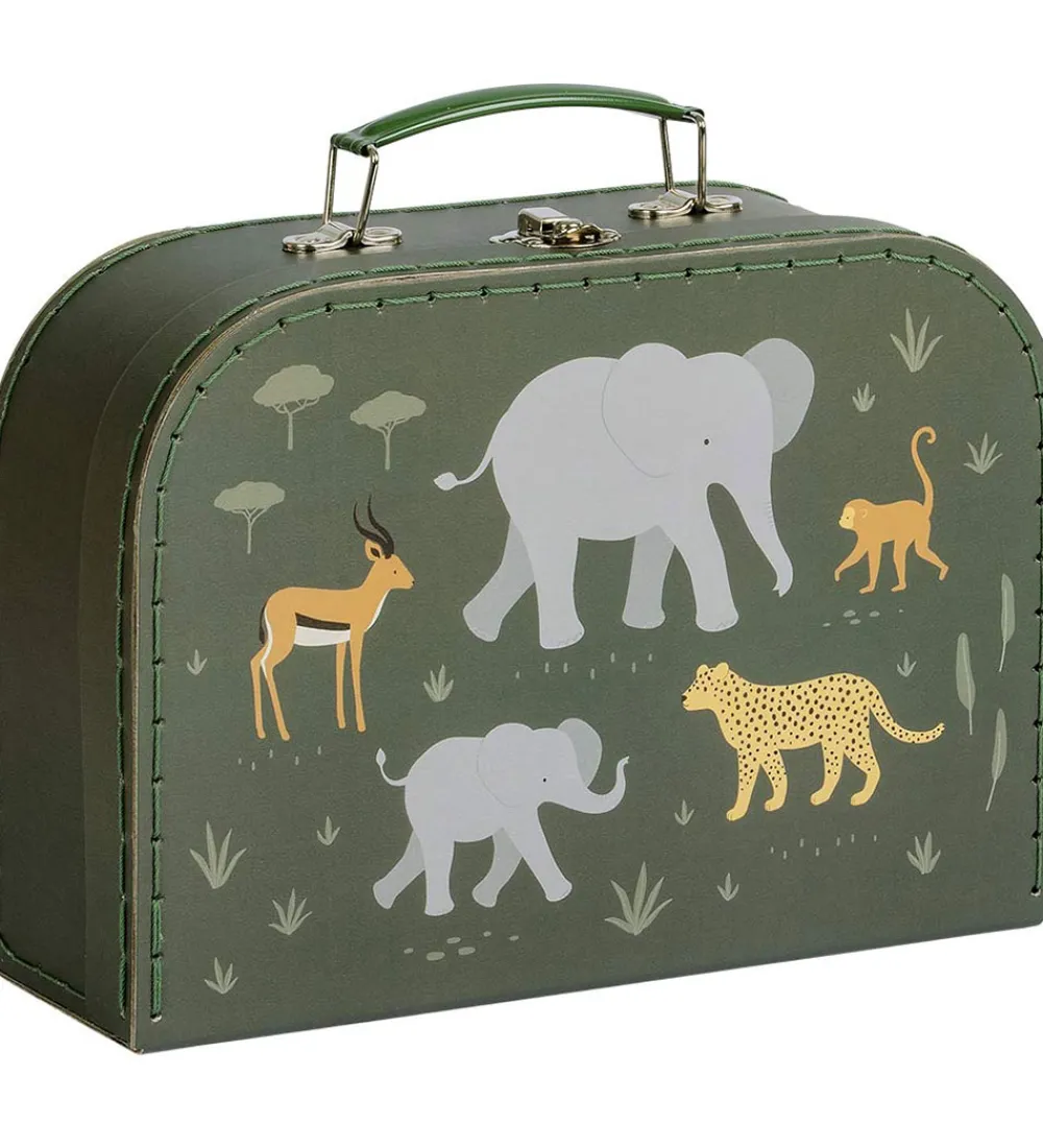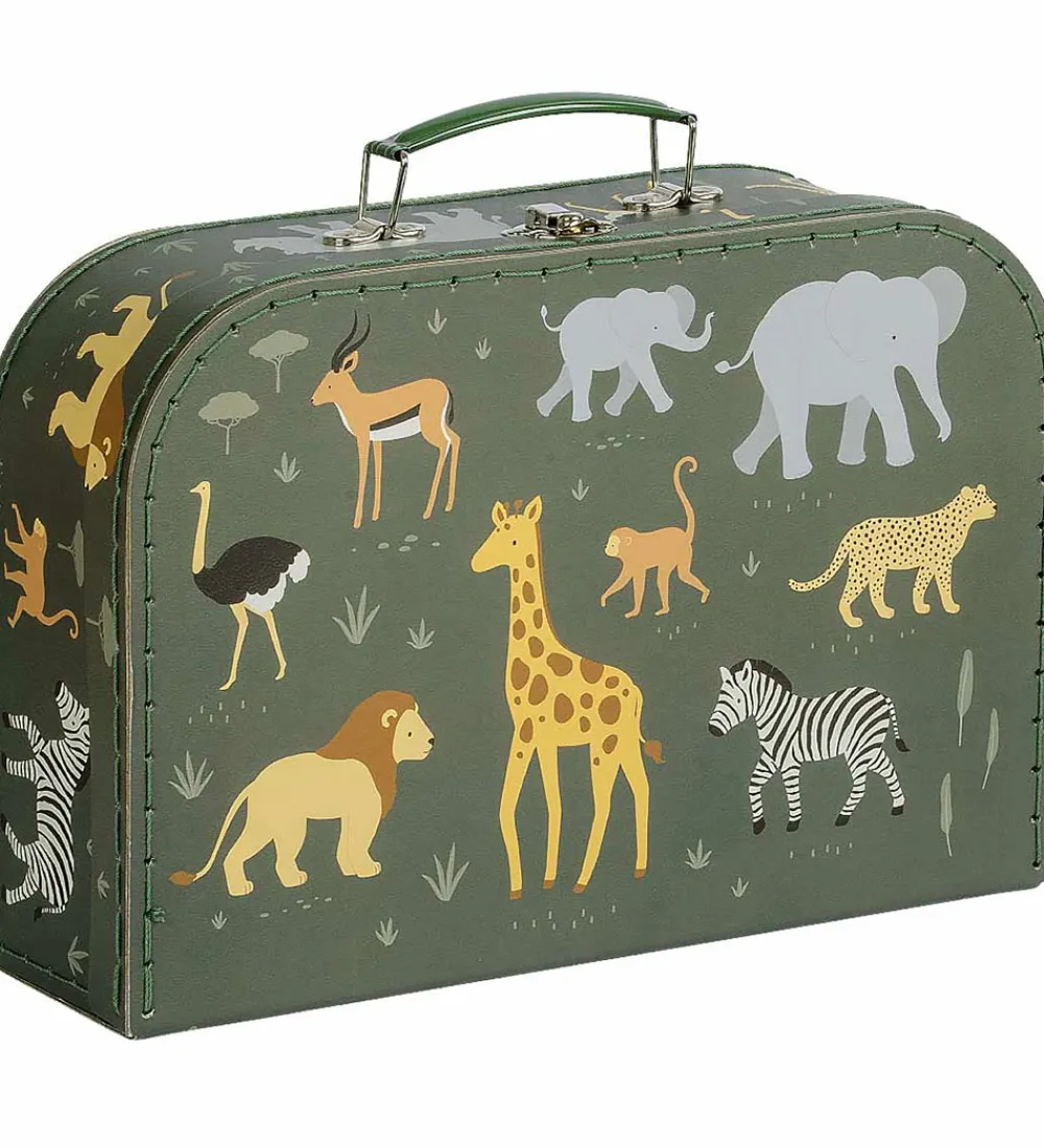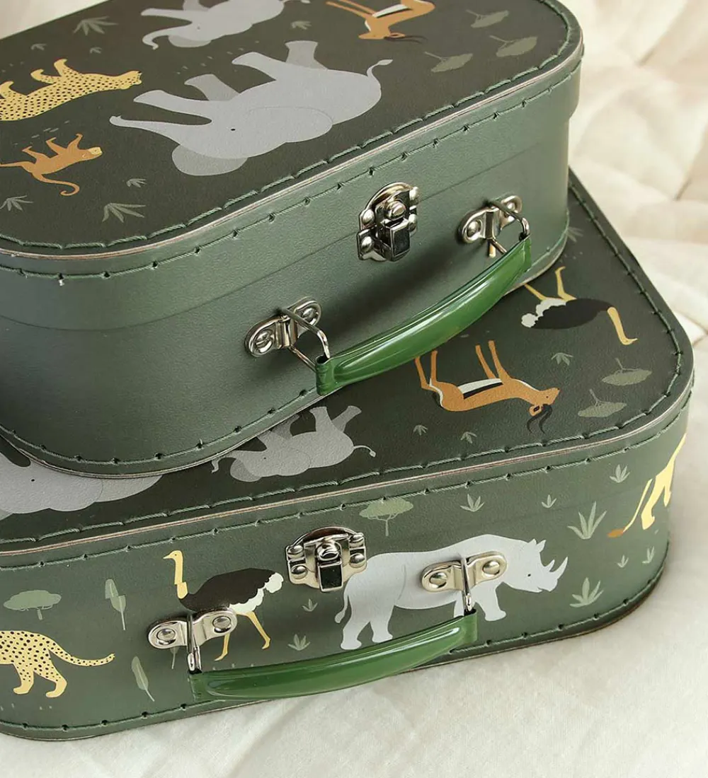Fint A Little Lovely Company kuffertsæt bestående af to kufferter i mørkegrøn med et alloverprint af savannedyr i forskellige farver.