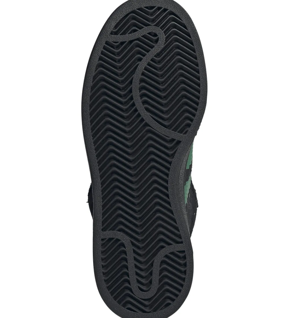 Smarte adidas Originals sko med Minecraft-tema i sort ruskind med grønne detaljer og grønne logostriber på både inder- og ydersiden.