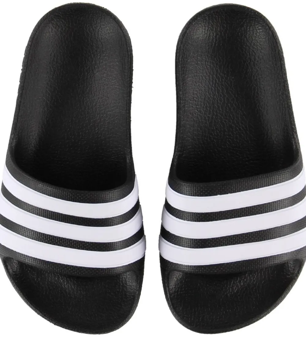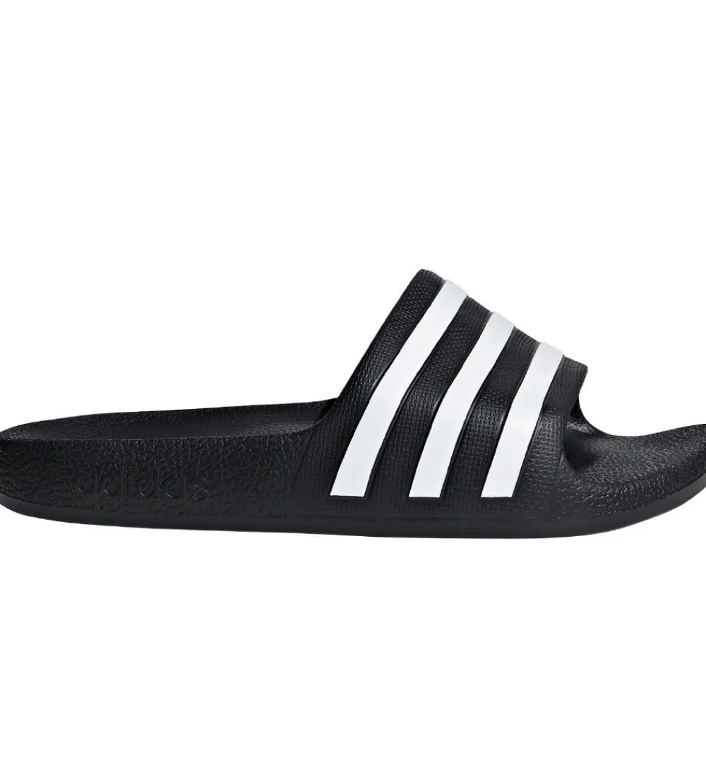Seje adidas Performance badesandaler i sort med brede remme over vristen. Over remmen er de tre velkente striber i hvid.