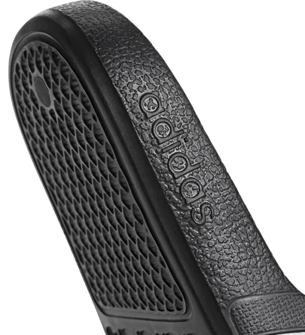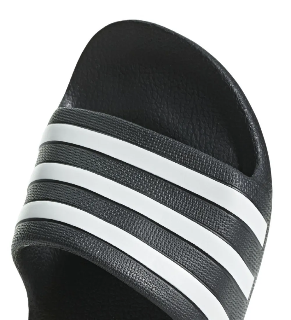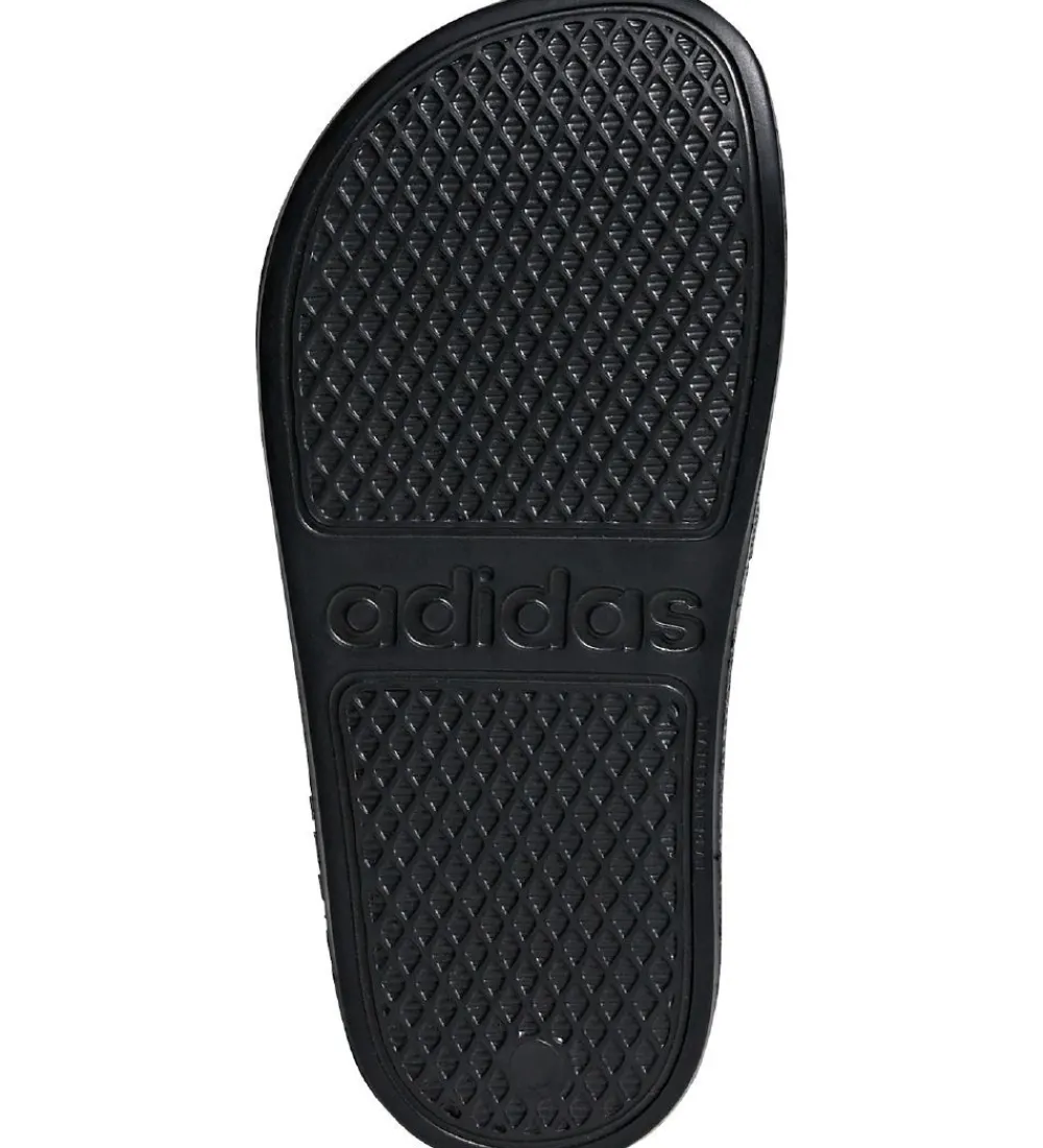 adidas Performance badesandalerne har en kontureret, indvendig sål, som giver foden god støtte. På ydersiden af hver sandal sidder et hvidt adidas-mærke.
