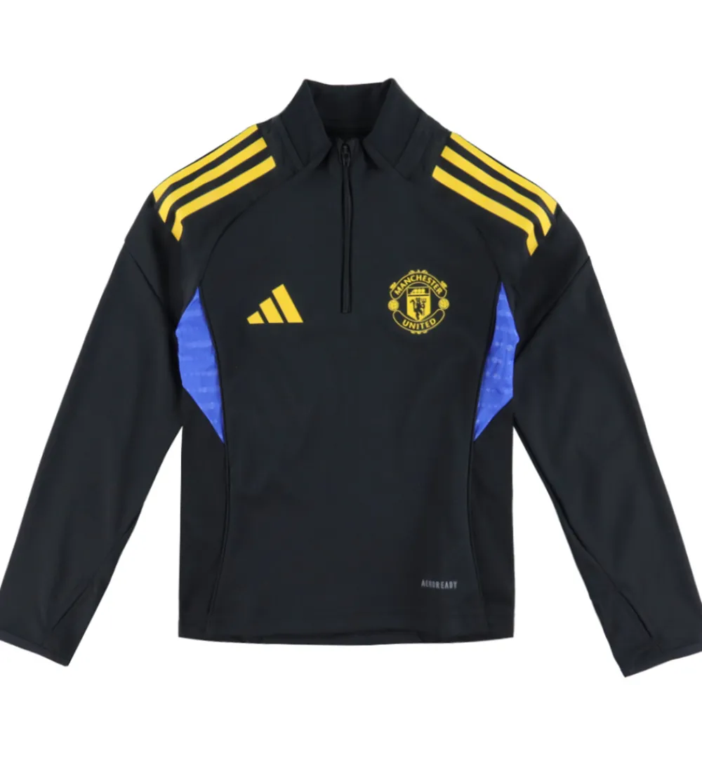 Flot adidas Performance træningsjakke i sort med detaljer i gul og blå, og fortil sidder der et logo for den engelske fodboldklub Manchester United.
