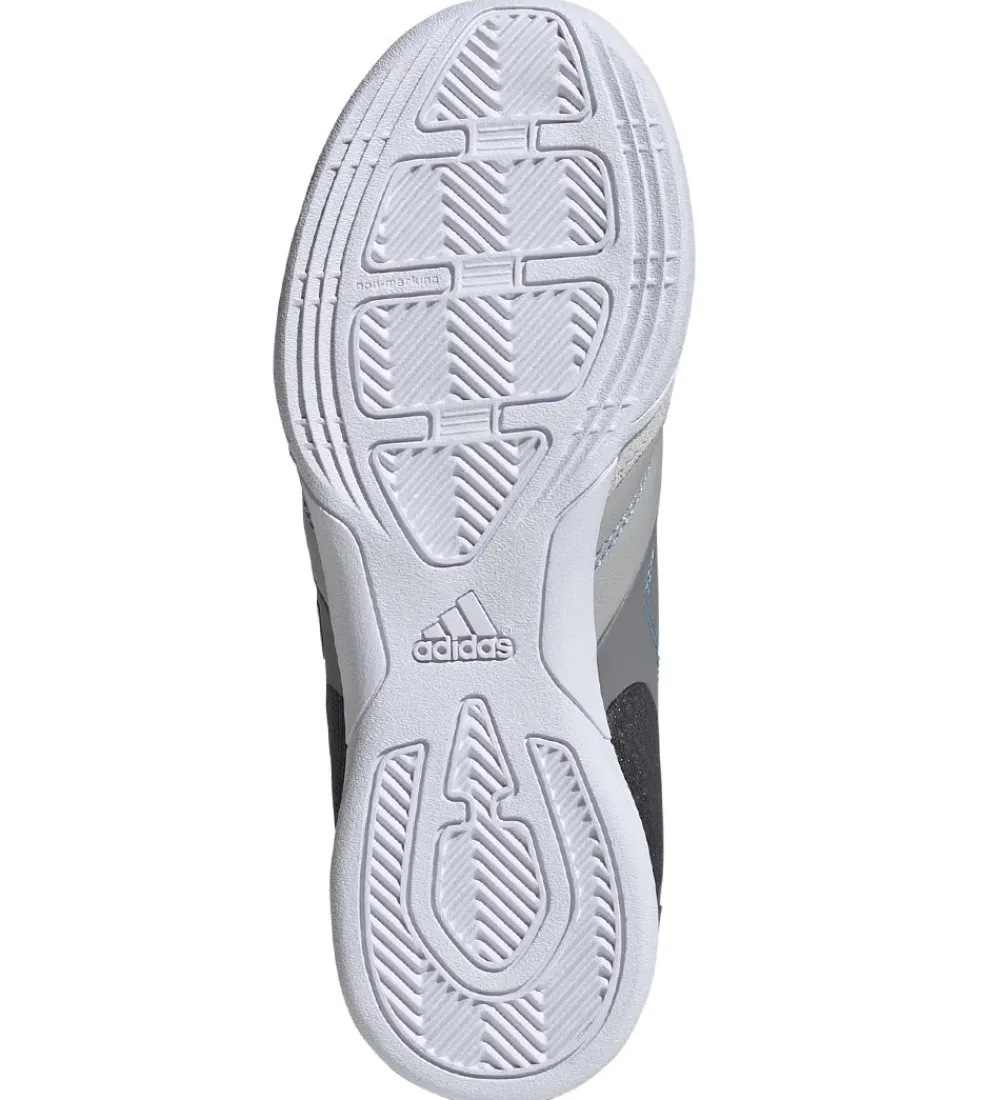 Smarte adidas Performance fodboldstøvler af skind og tekstil i grå nuancer med blå syninger og logoer. Fodboldstøvlerne er beregnet til indendørs brug.
