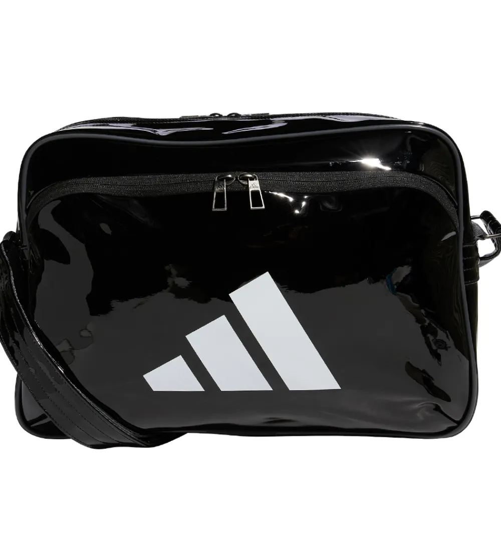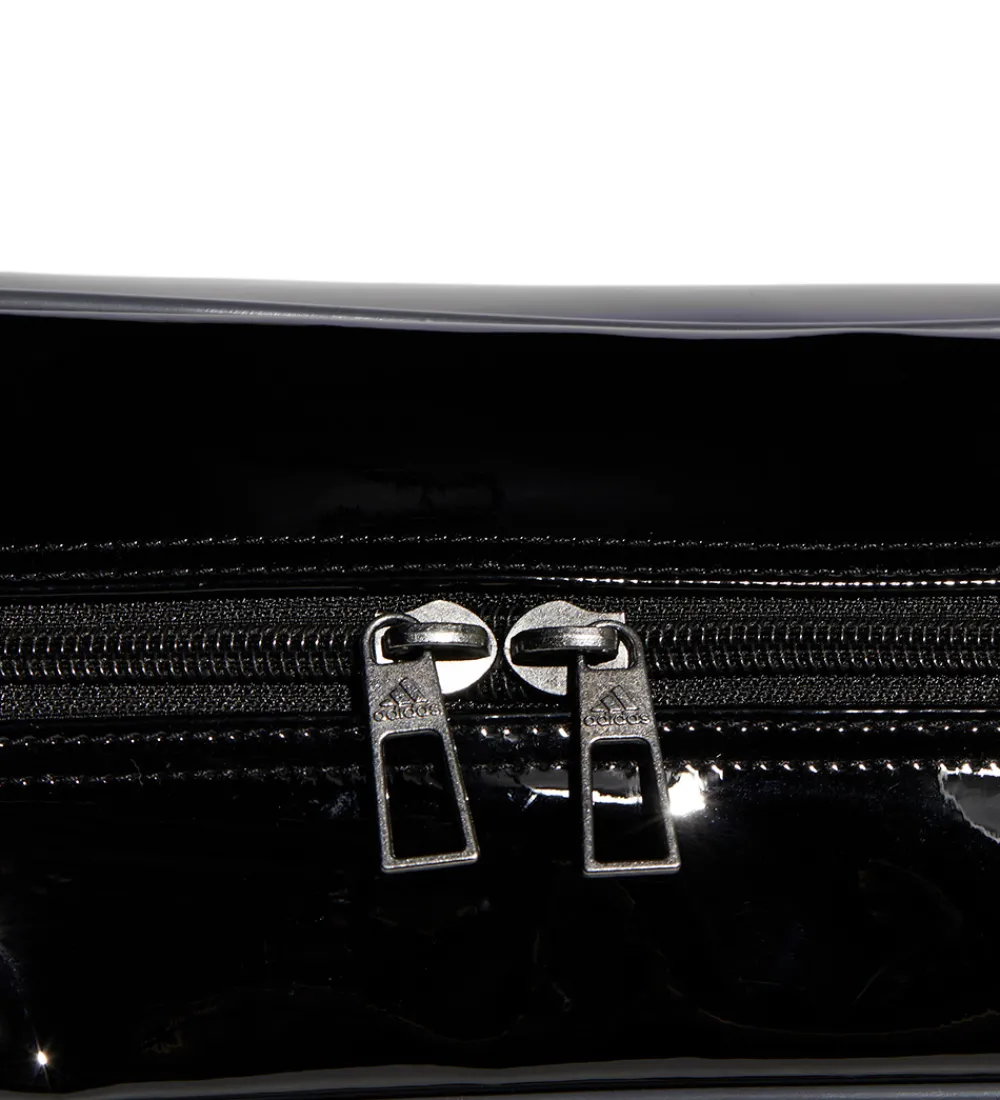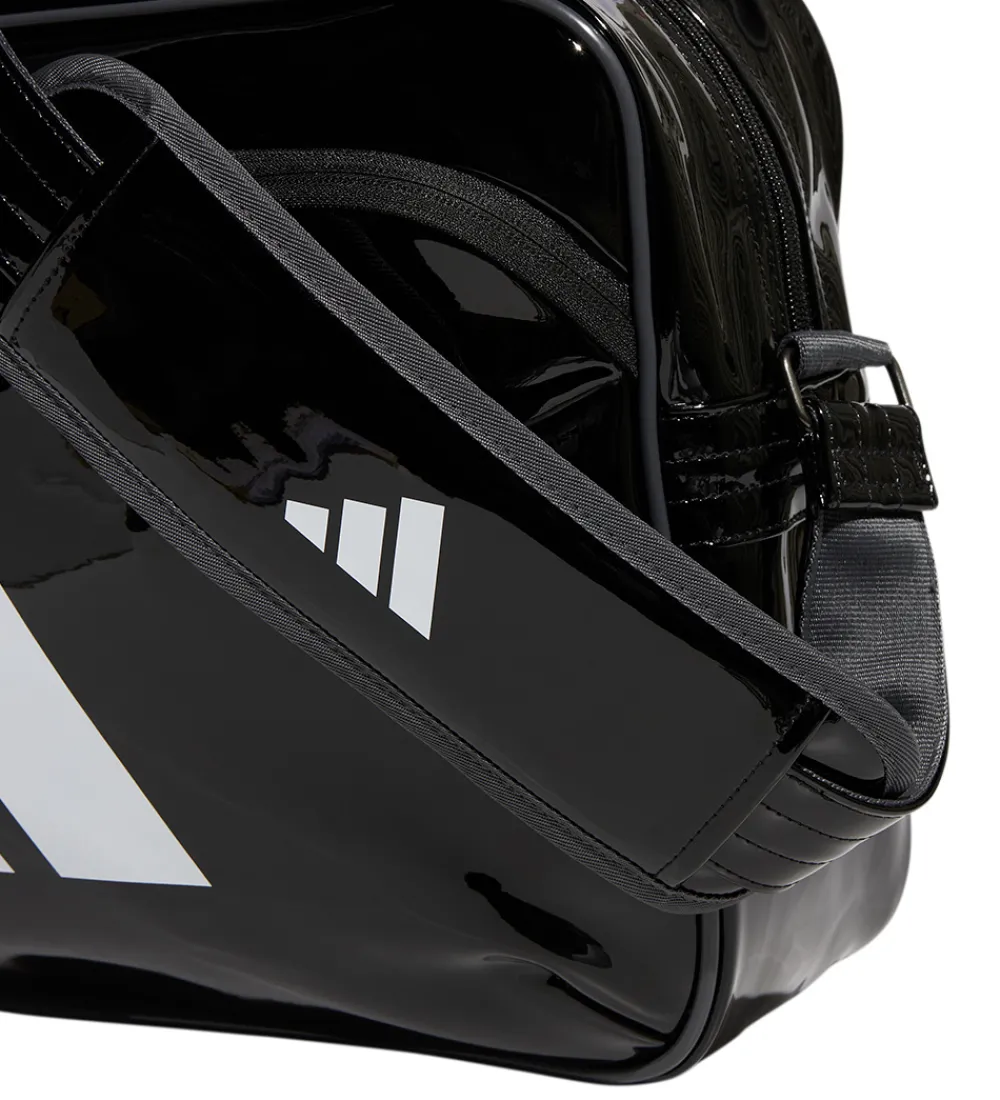 Flot adidas Performance sportstaske i skinnende sort PU med et stort, hvidt logoprint.