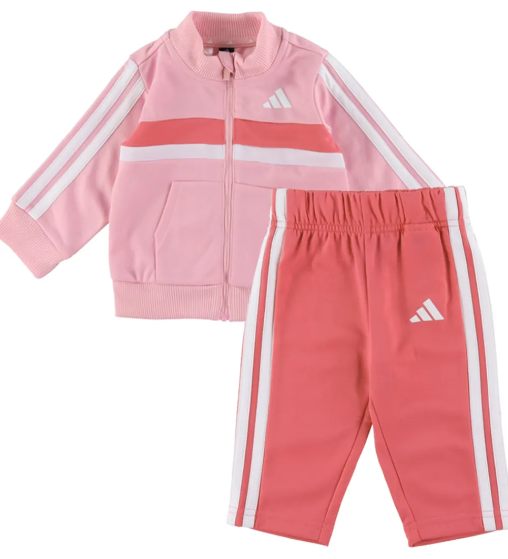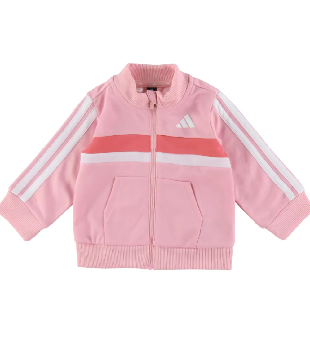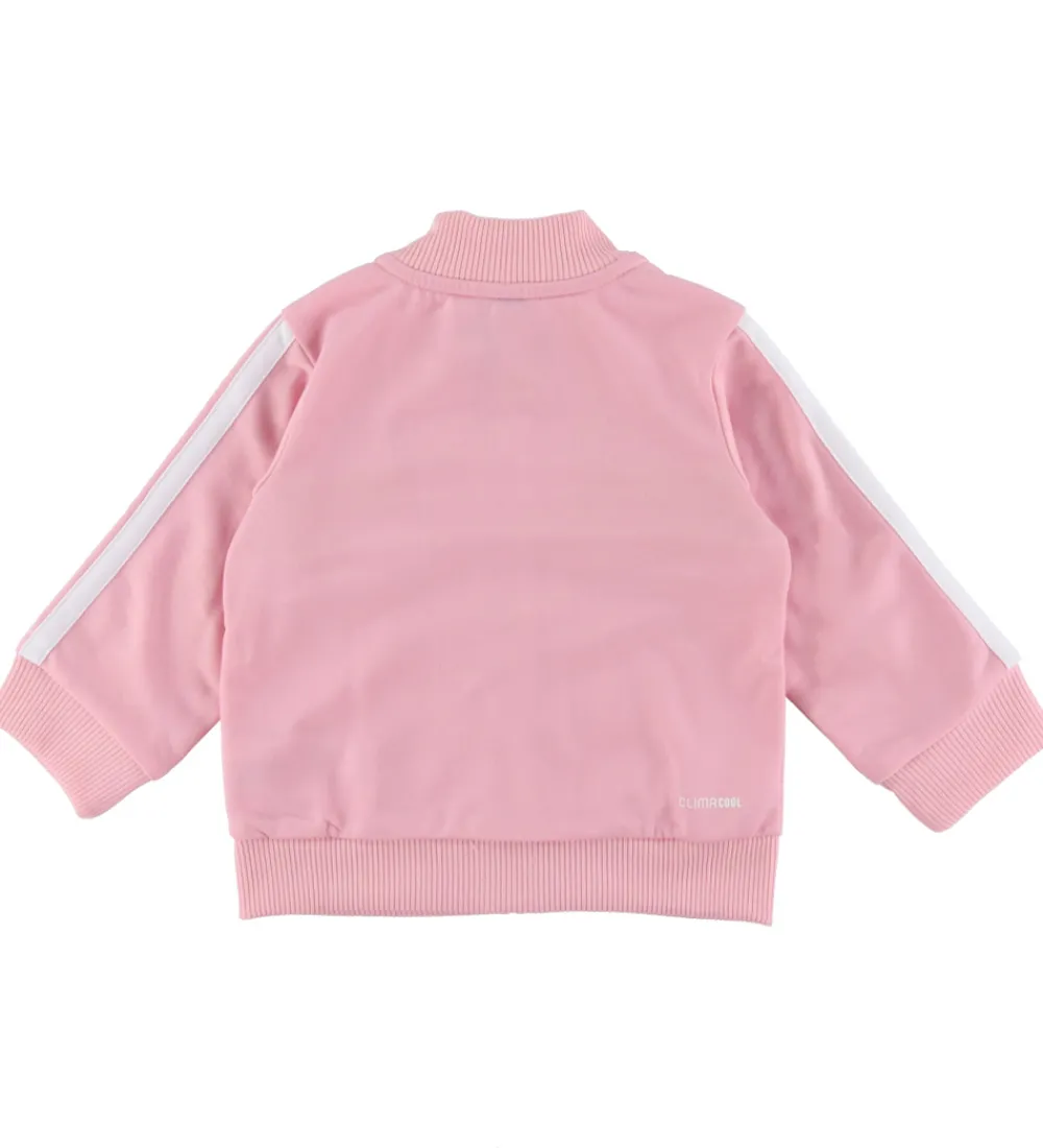 Fint adidas Performance træningssæt i bestående af en cardigan i lys rosa og et par bukser i mørk rosa. Cardiganen har detaljer langs brystet i mørk rosa og hvid og hvide striber langs ærmerne. På venstre bryst er der et hvidt logoprint. Bukserne har hvide striber langs benene og et hvidt logoprint på venstre lår.