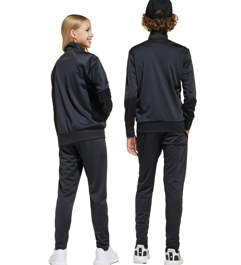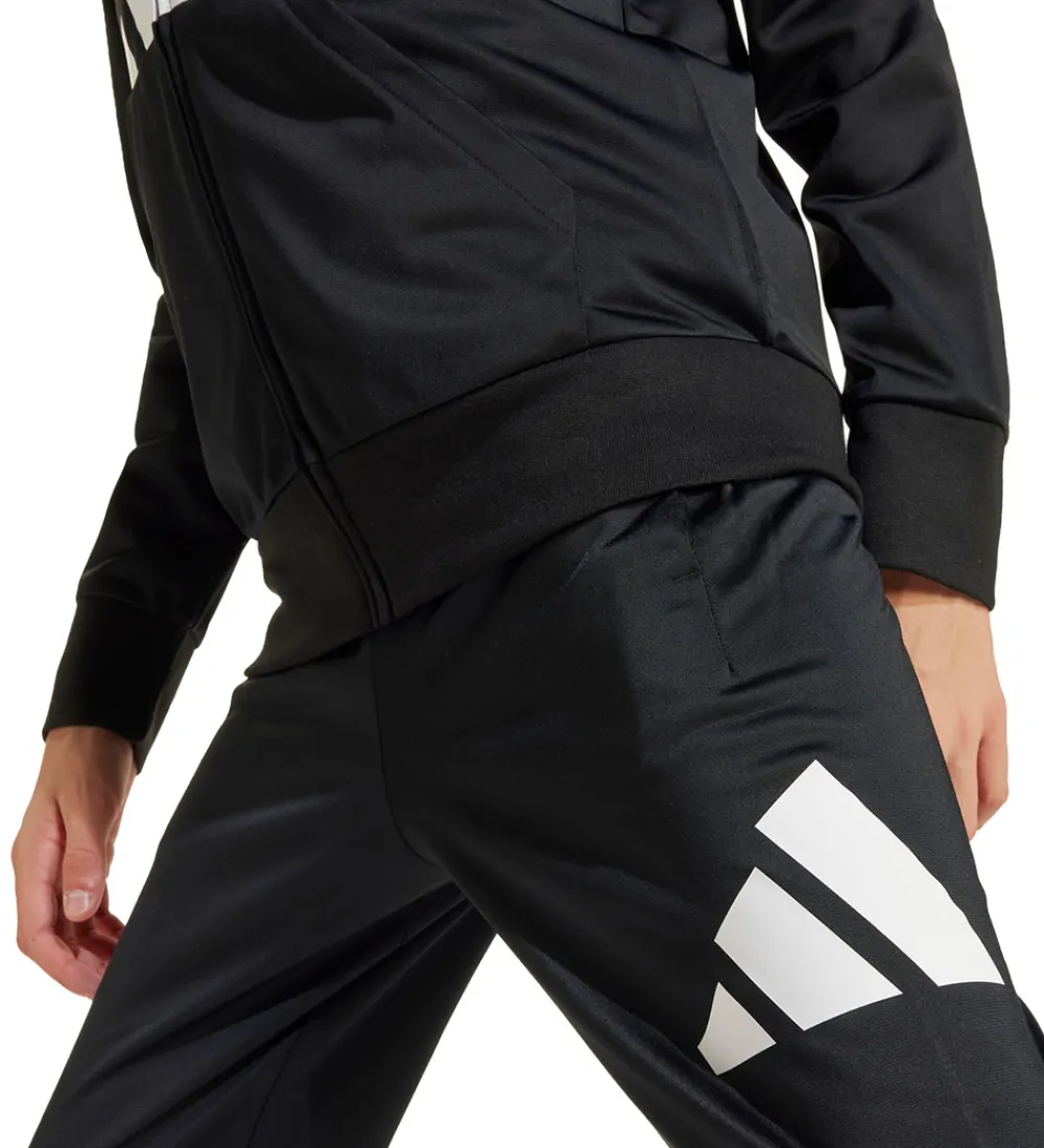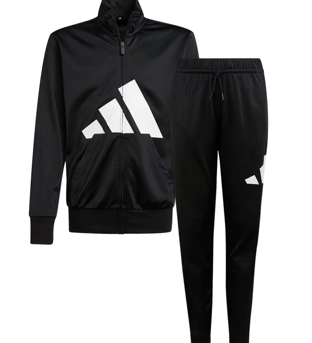 Stilsikkert adidas Performance træningssæt i sort med et stort hvidt logoprint på fronten. Sættet består af en cardigan med lynlås og træningsbukser, der sikrer komfort og bevægelsesfrihed under aktiviteter.