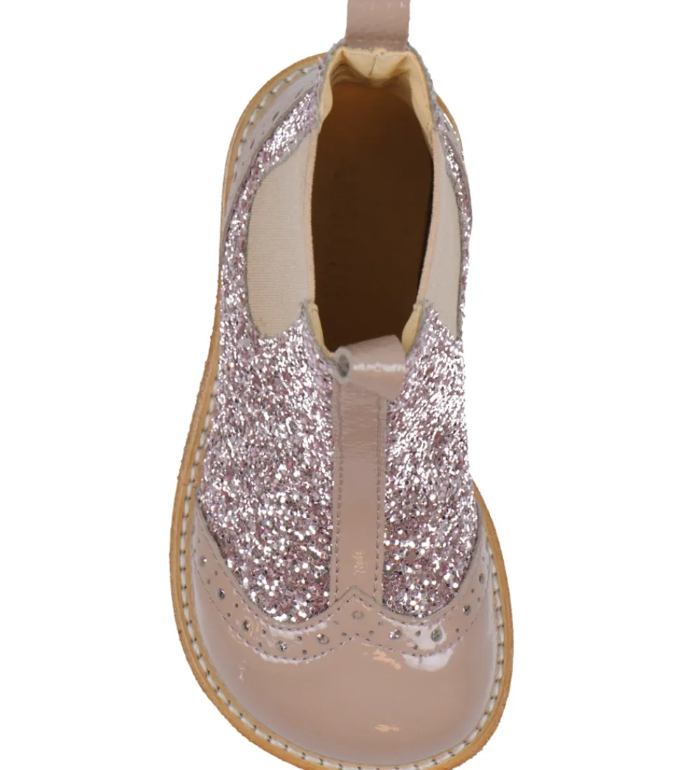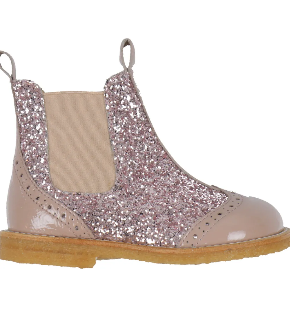 Skinnende Angulus støvler i blankt gammelrosa læder med glimmer i rosa nuancer, der giver et iøjnefaldende udtryk. Støvlerne har et fint hulmønster henover snuden og ved hælen.