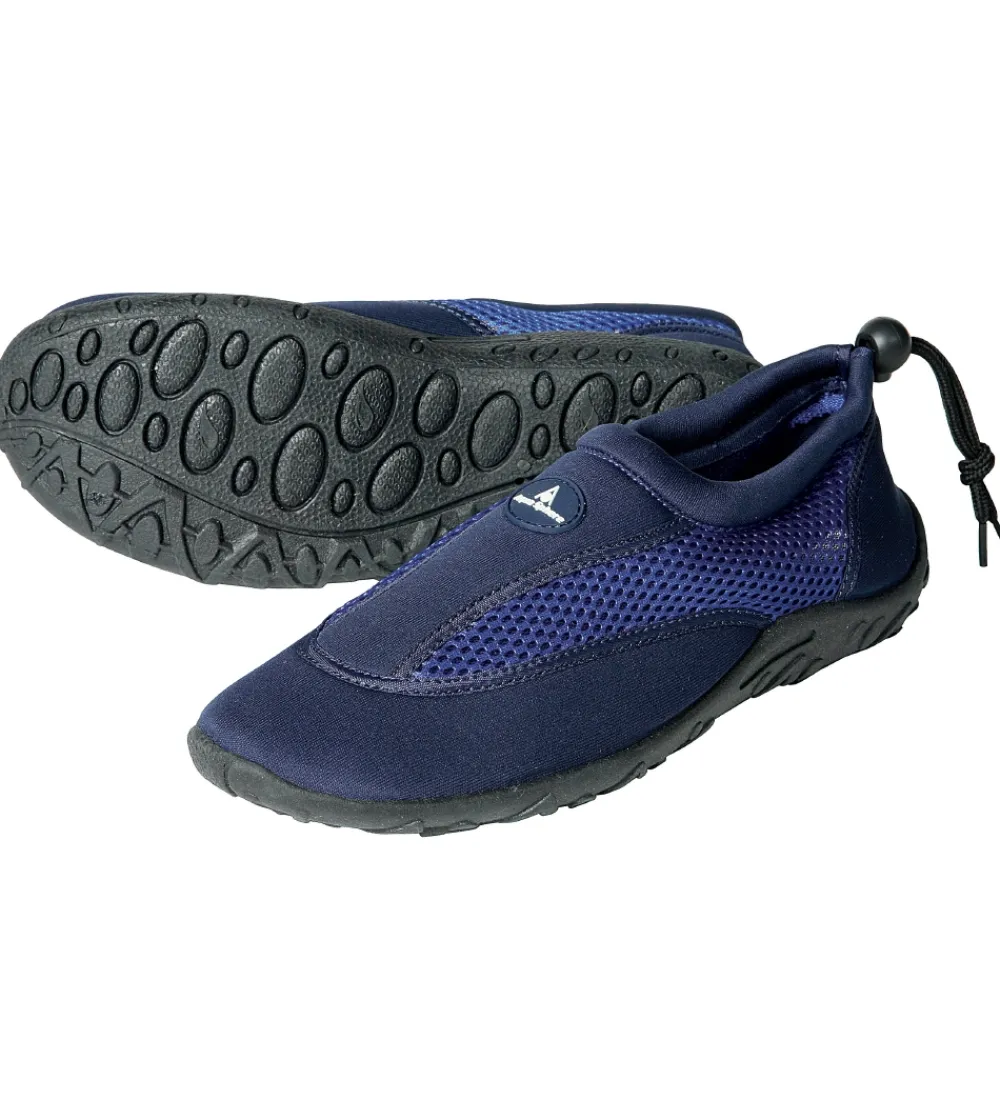 Aqua Lung badeskoene har en yderside af sort neopren og blåt mesh langs siderne af fødderne, og i kanten af åbningen kan de strammes ind med en snøre med et spænde bagpå. Indvendigt er der en sål, som let kan tages ud af skoene. Aqua Lung badeskoene har en ydersål af fleksibelt gummi med mønster, som går op mod snuden og hælen og sikrer god fodfæste og beskyttelse.