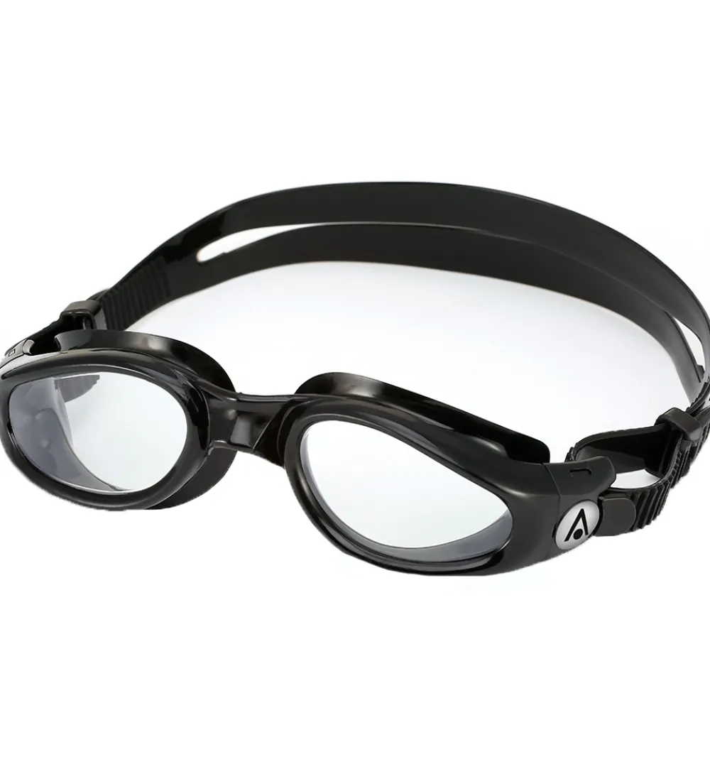 Gode Aqua Sphere svømmebriller i sort med klart brilleglas.