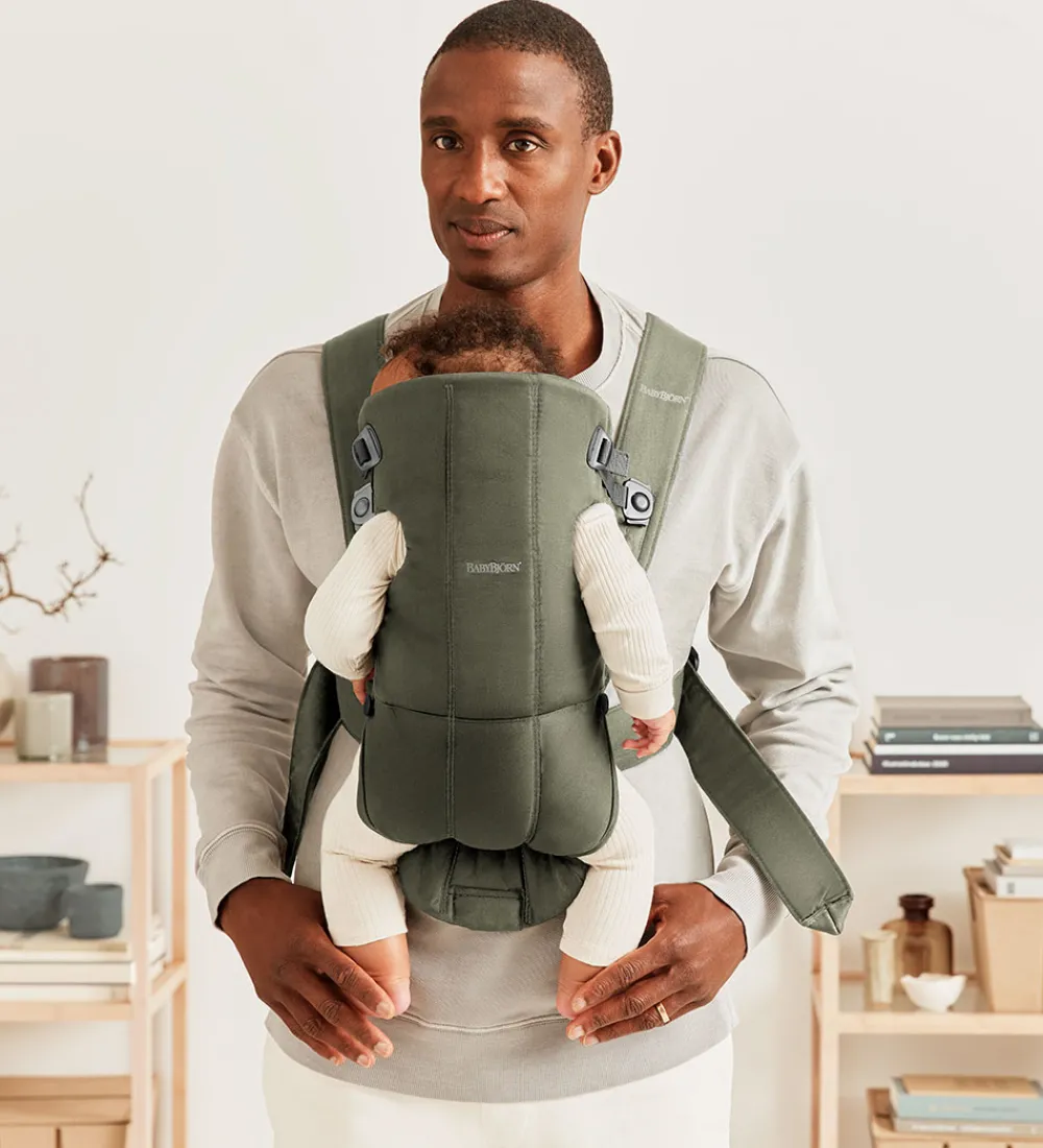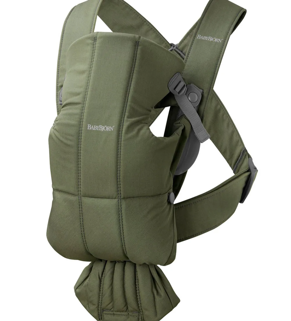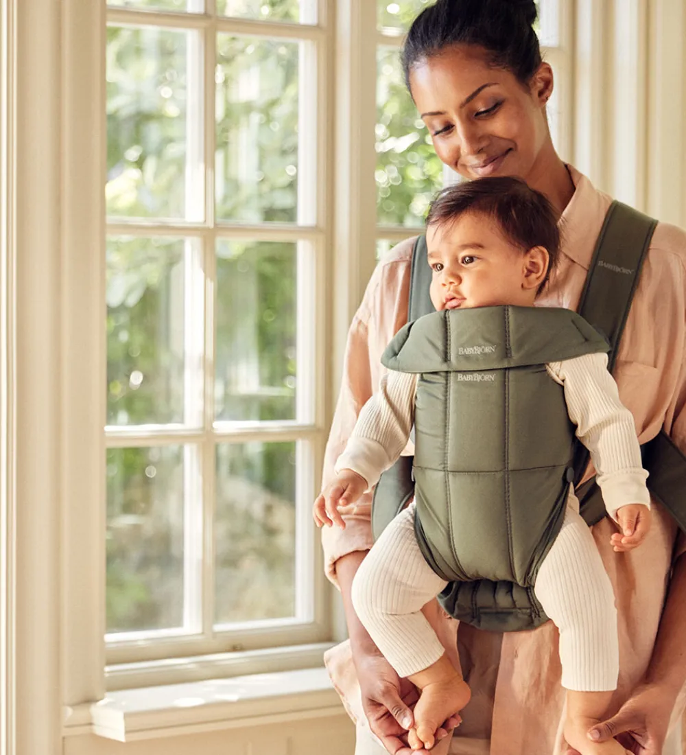 Praktisk BabyBjörn bæresele i mørkegrøn med vævet struktur.