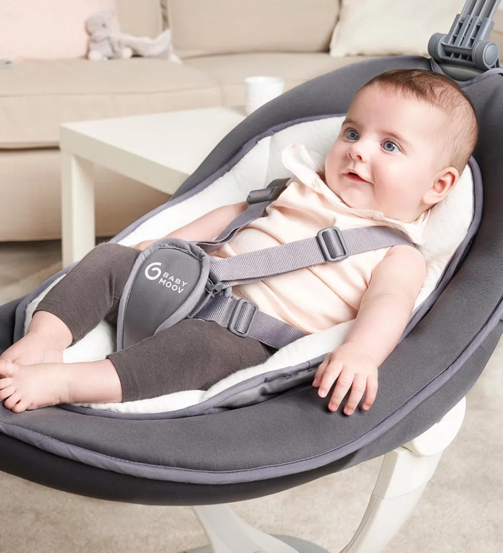 Smart Babymoov skråstol i modellen Swoon Motion Electric 360° i et gråt og hvidt farvetema.