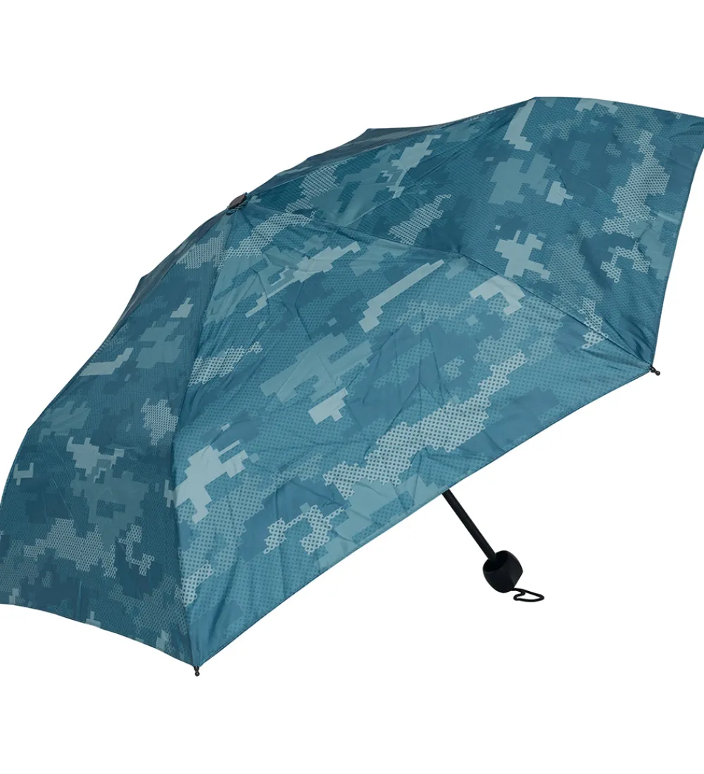 Smart Beckmann paraply i grønne nuancer med et smart mønster med forskellige former og små prikker. Paraplyen er let at slå ud og i, og stangen har et rundt håndtag nederst med en strop, som kan tages omkring håndleddet. Når paraplyen pakkes sammen, kan skærmen holdes på plads med en praktisk rem med velcro.