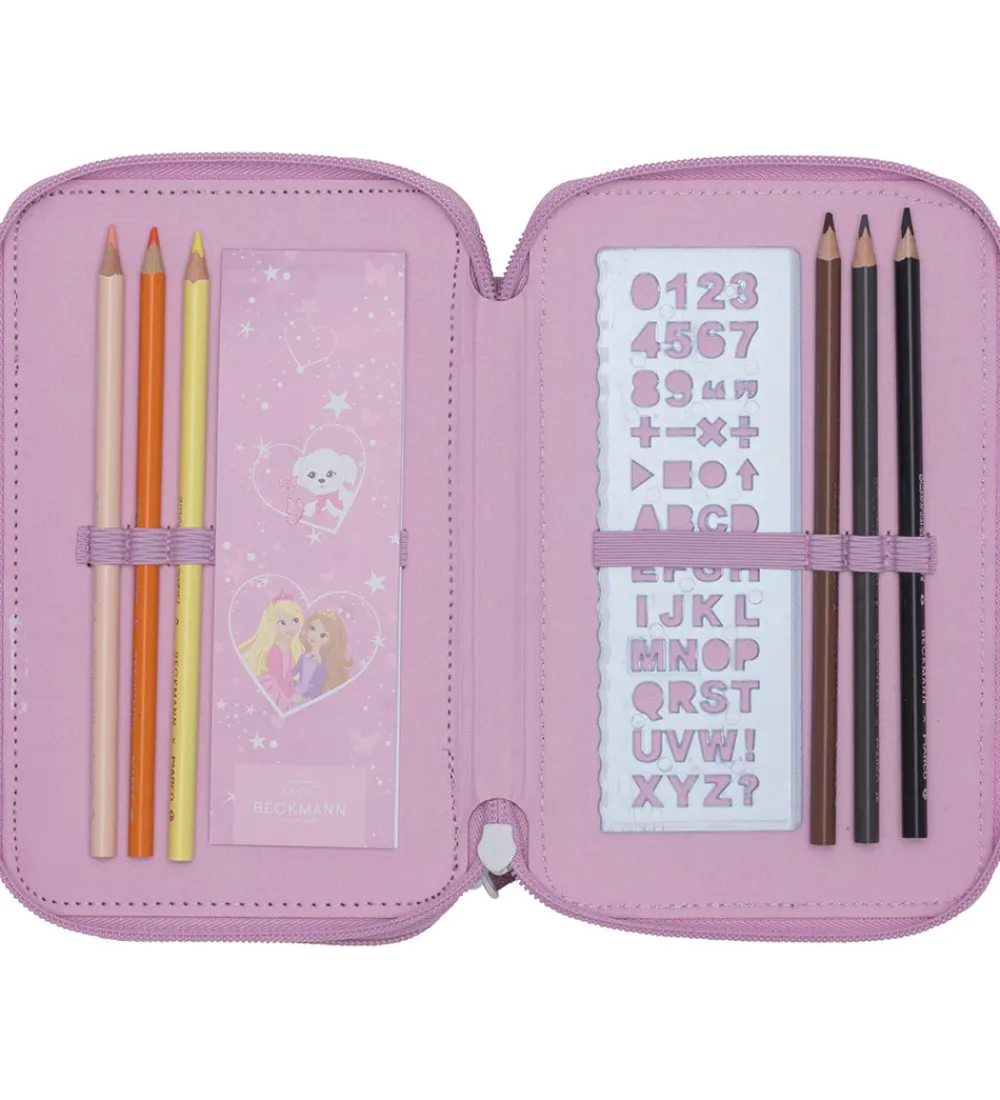 Sejt Beckmann penalhus i en lys, rosa nuance med et sødt print af en prinsesse og hendes kæledyr på fronten.