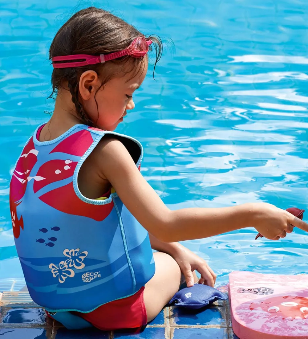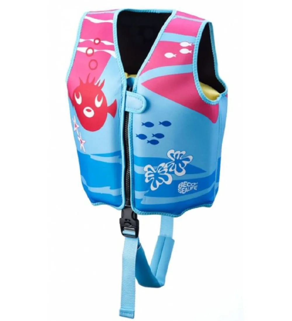 Fin BECO svømmevest i blå og rosa med et print af kuglefisk, små fisk, søstjerner, blomster og bølger.