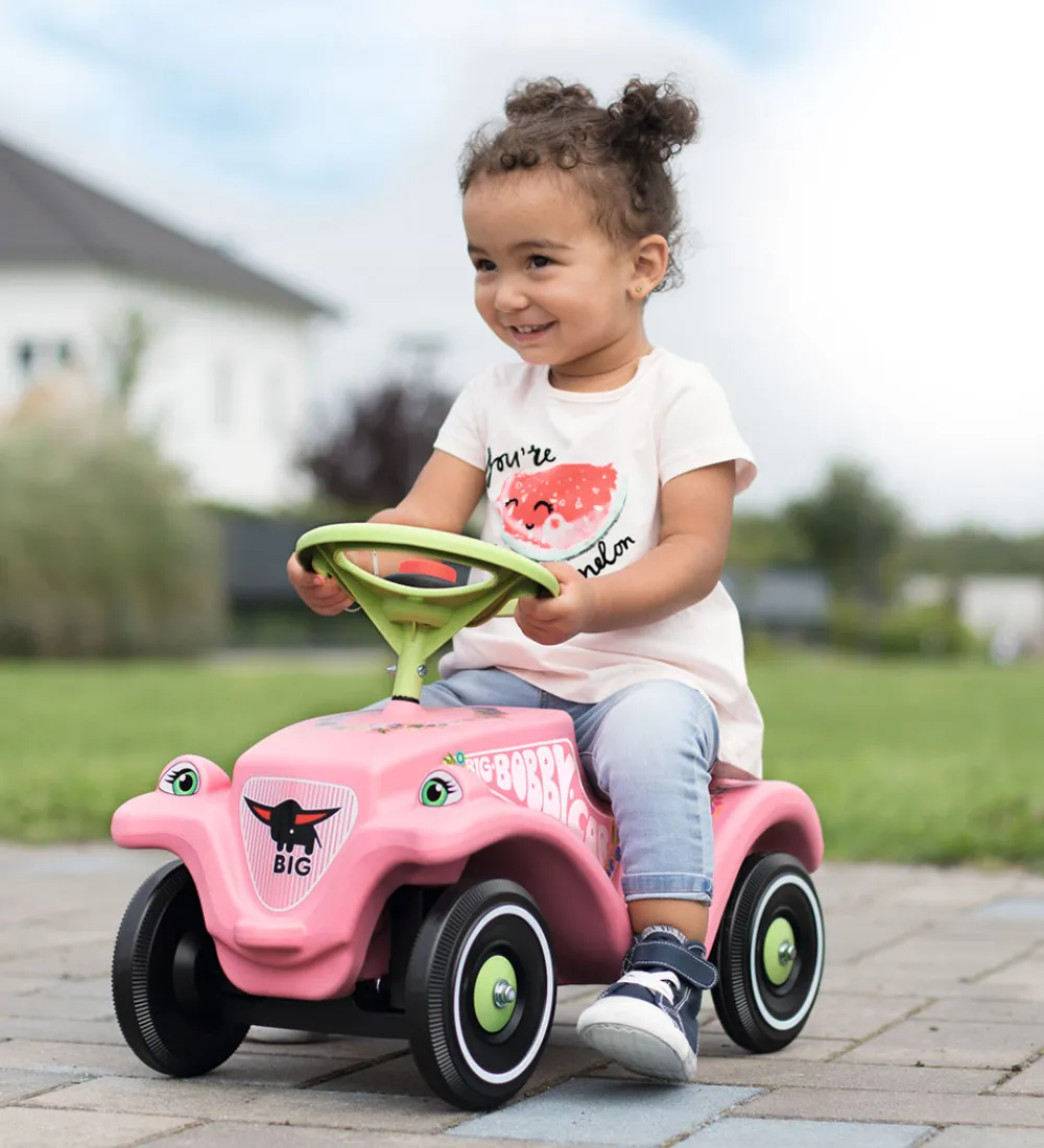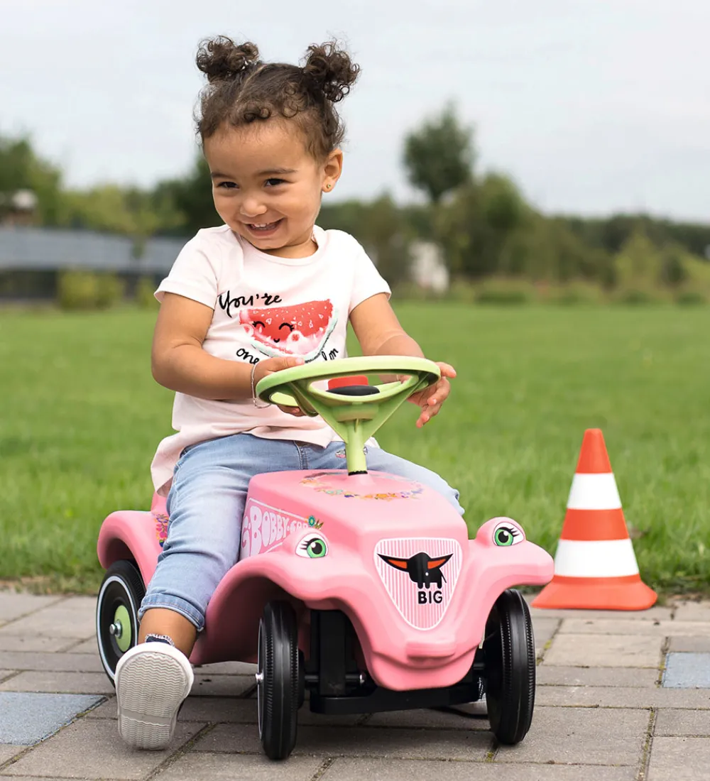 Big bilen har et ergonomisk design og en stabil konstruktion, så barnet sidder godt. Ved rattet sidder et horn, som siger en lyd når man trykker på det. Foran og bagpå er der et anhængertræk, hvor man kan sætte tilbehør og anhængere fra Big fast. Bilen kan både bruges indendørs og udendørs, og styrker barnets motorik på en sjov måde.