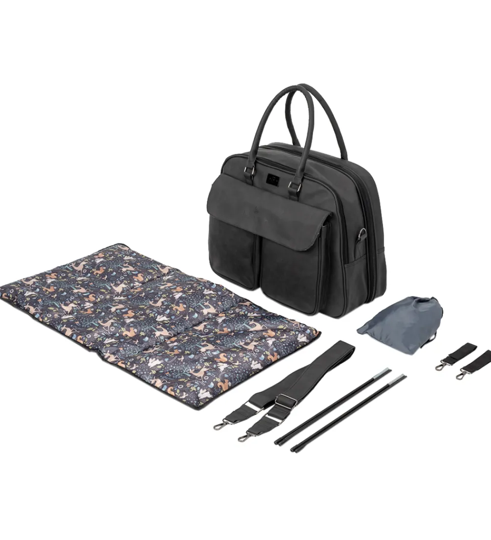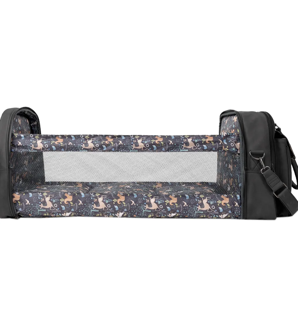 Smart Bizzi Growin kombineret pusletaske og rejseseng i sort, vegansk læder. Indvendigt har den et sort for med et farverigt dyreprint.