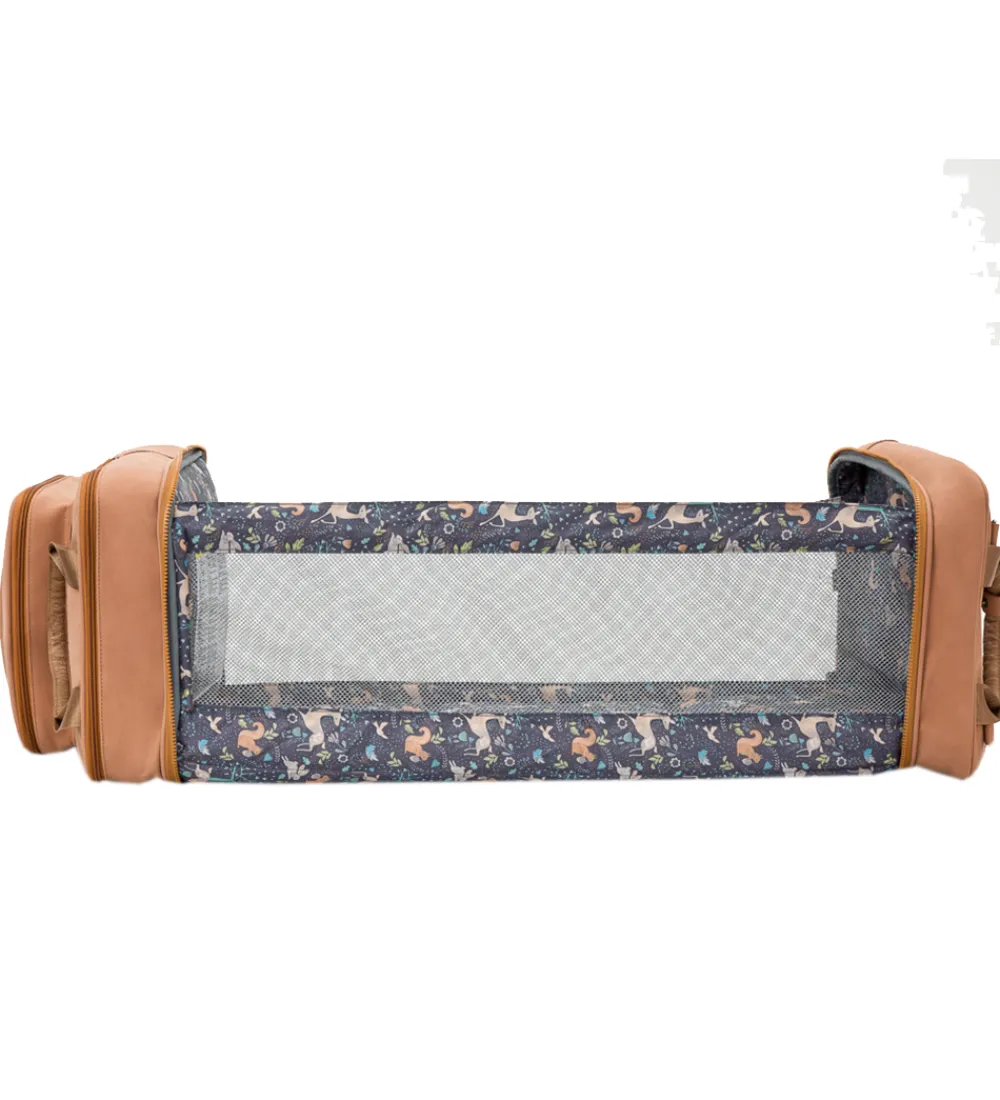 Smart Bizzi Growin kombineret pusletaske og rejseseng i lysebrunt, vegansk læder. Indvendigt har den et sort for med et farverigt dyreprint.