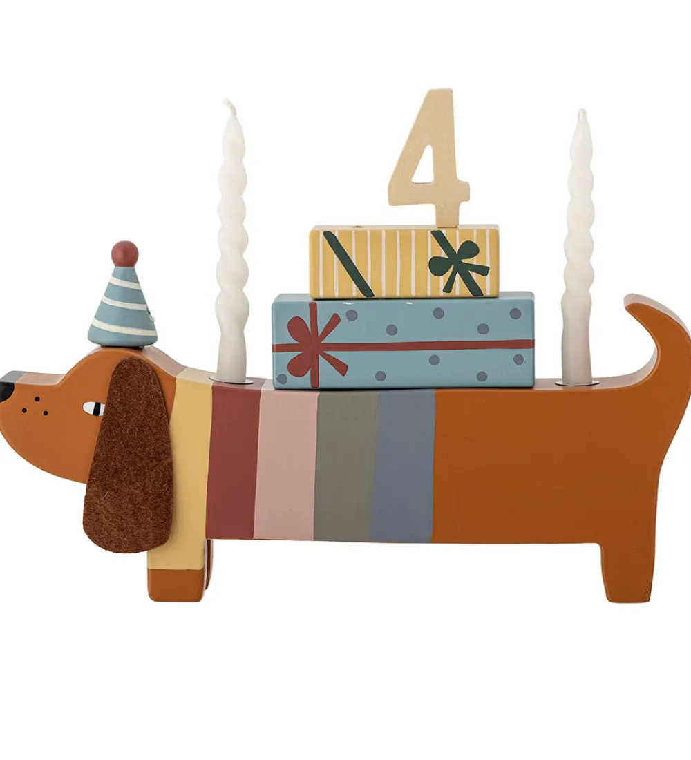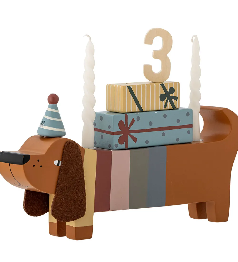 Sød Bloomingville Mini fødselsdagsdekoration, der forestiller hunden Charlie i malet træ med fødselsdagshat og gaver. Der medfølger også tal fra 0 til 9.