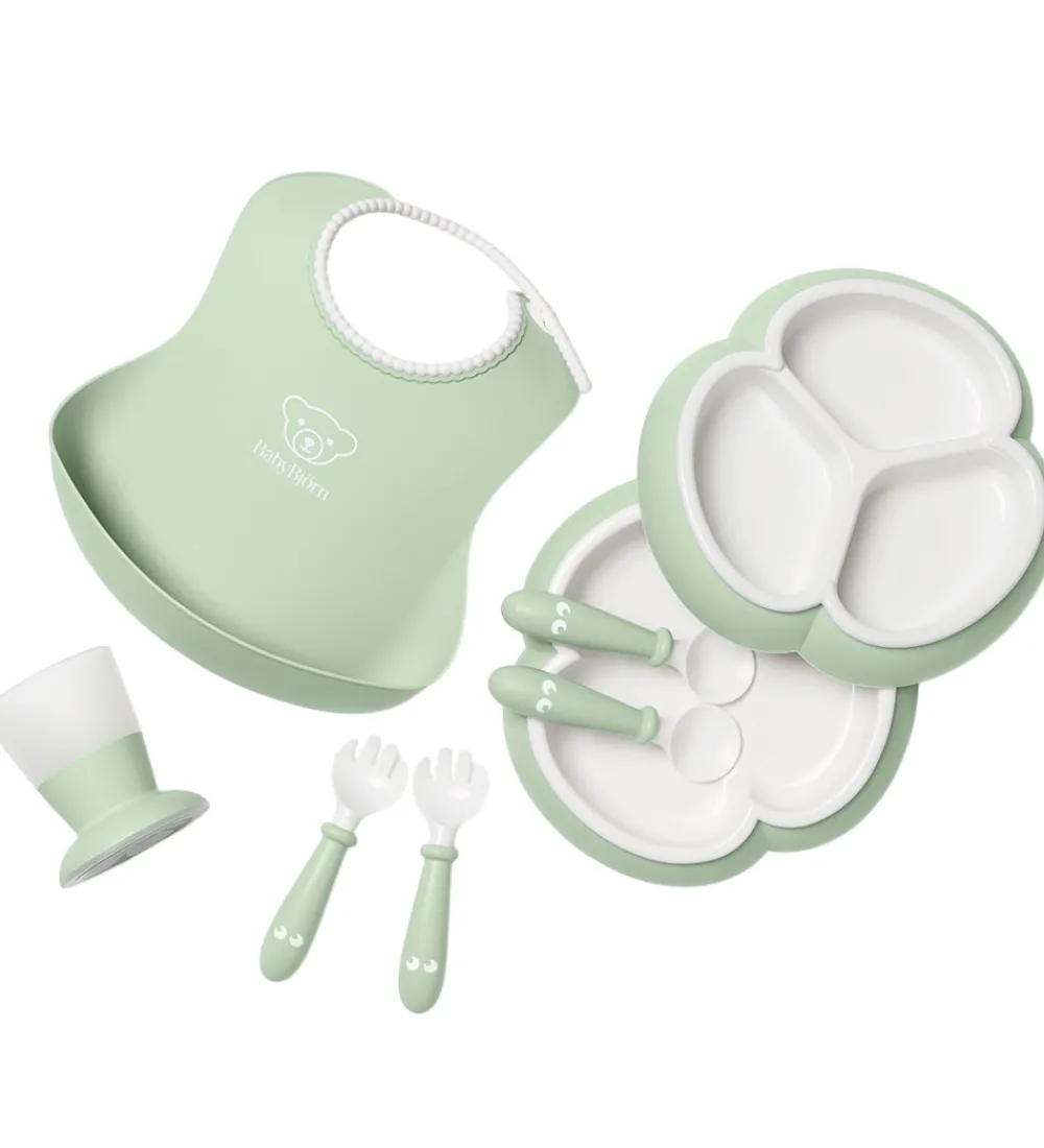 Skønt BabyBjörn spisesæt i pastelgrøn og hvid bestående af følgende otte dele: