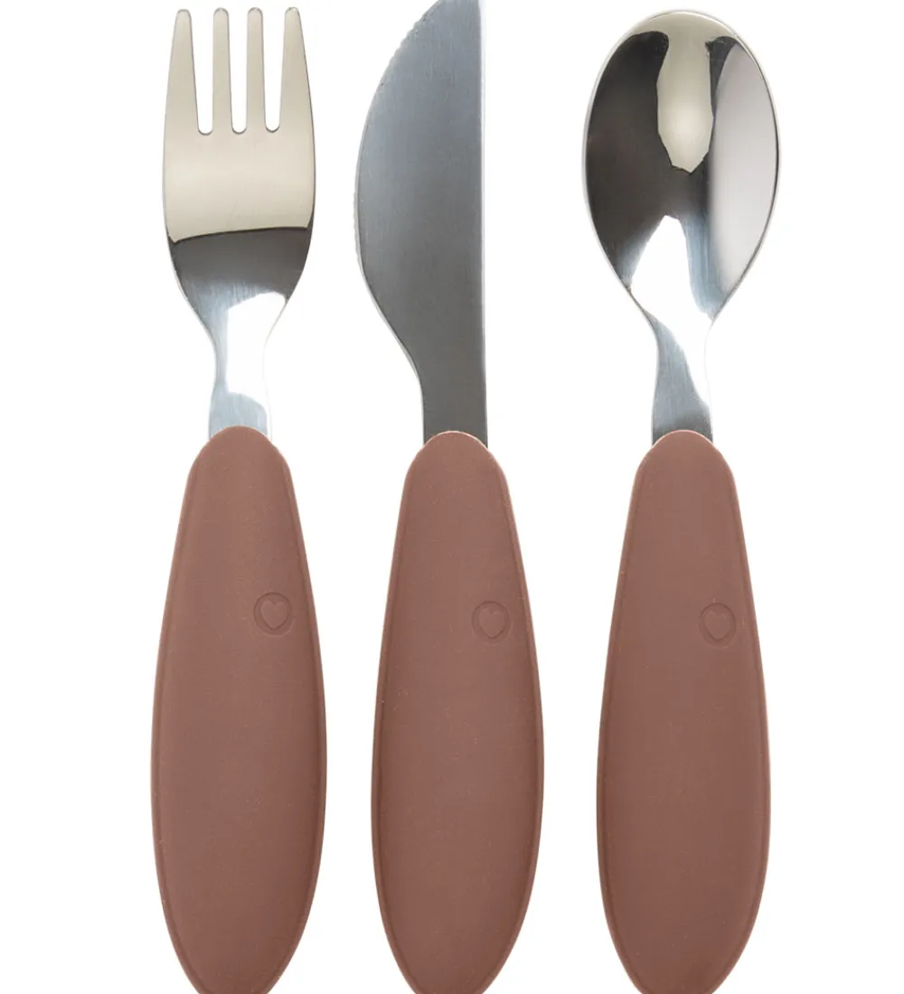 Sødt BIBS børnebestik i et sæt med en kniv, en gaffel og en ske i metal med et skaft i støvet rødbrun.