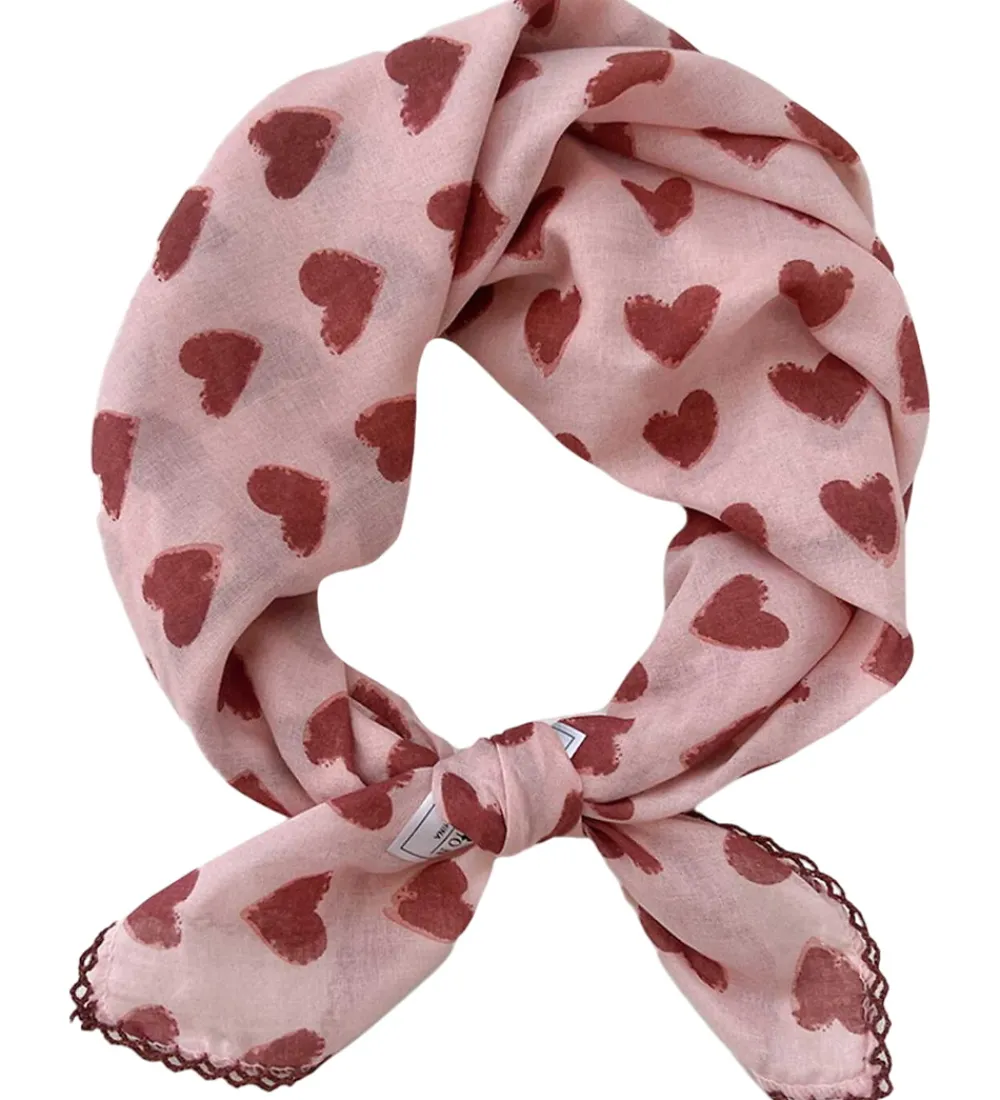 Fint By Stær tørklæde i rosa med print af røde hjerter og en mørkerød syningsdetalje langs kanten. Tørklædet fra By Stær har en kvadratisk form og tilføjer et smart udtryk til outfittet.