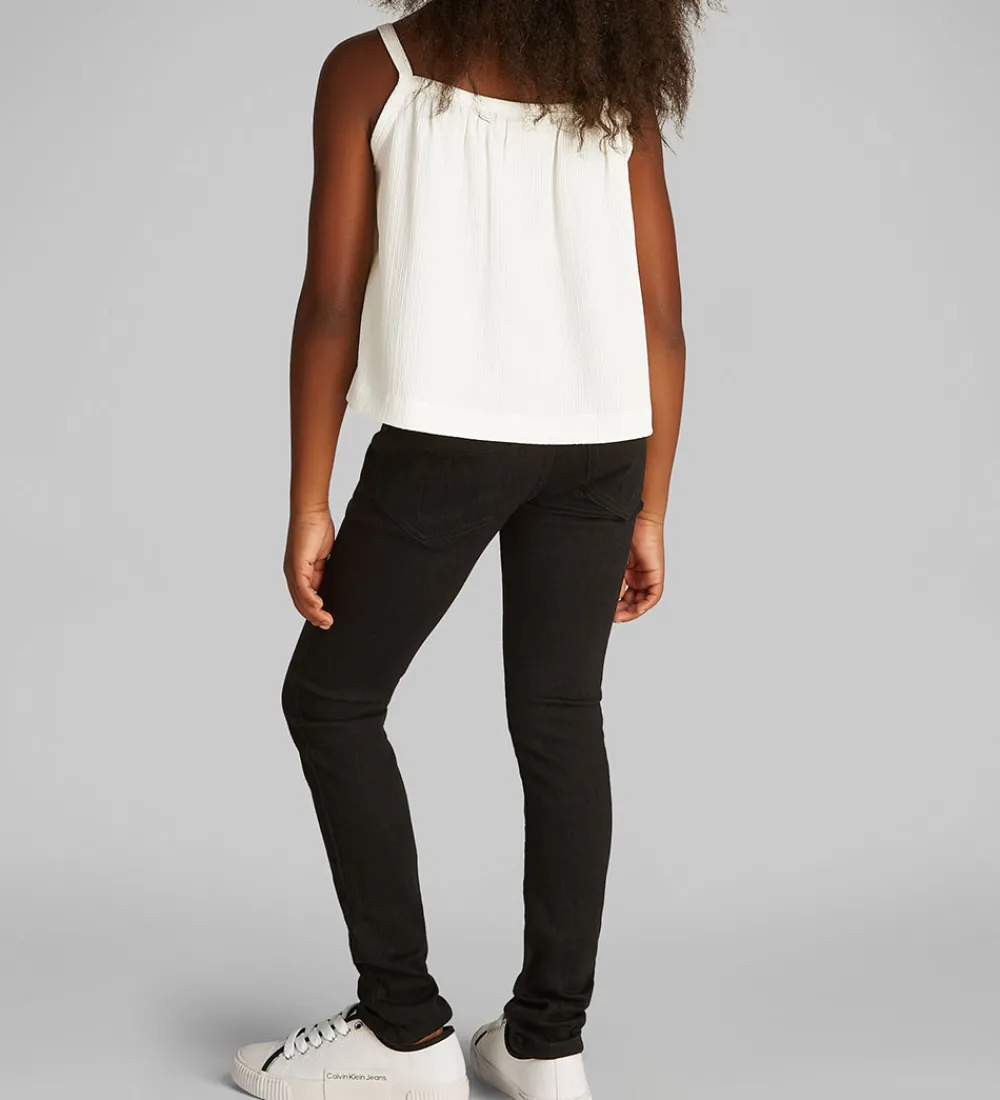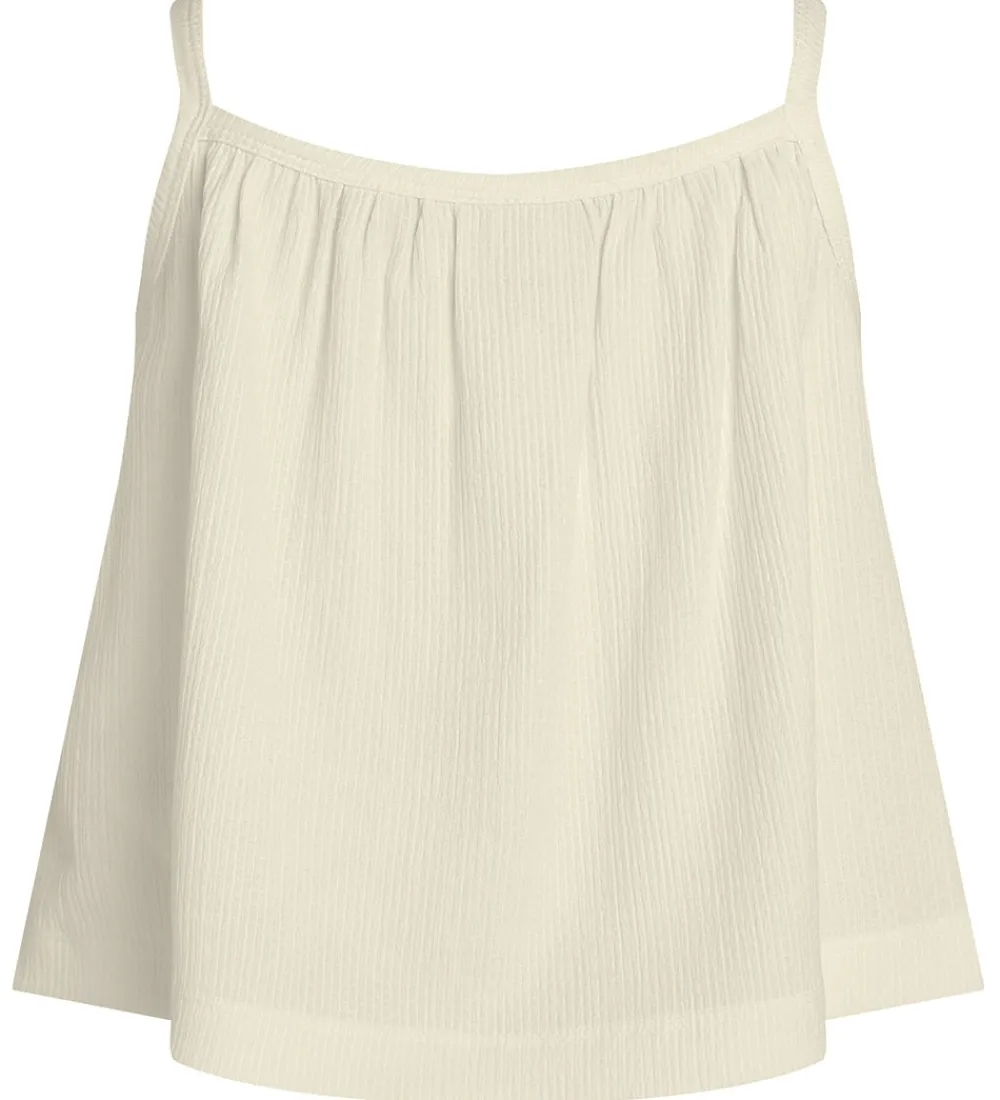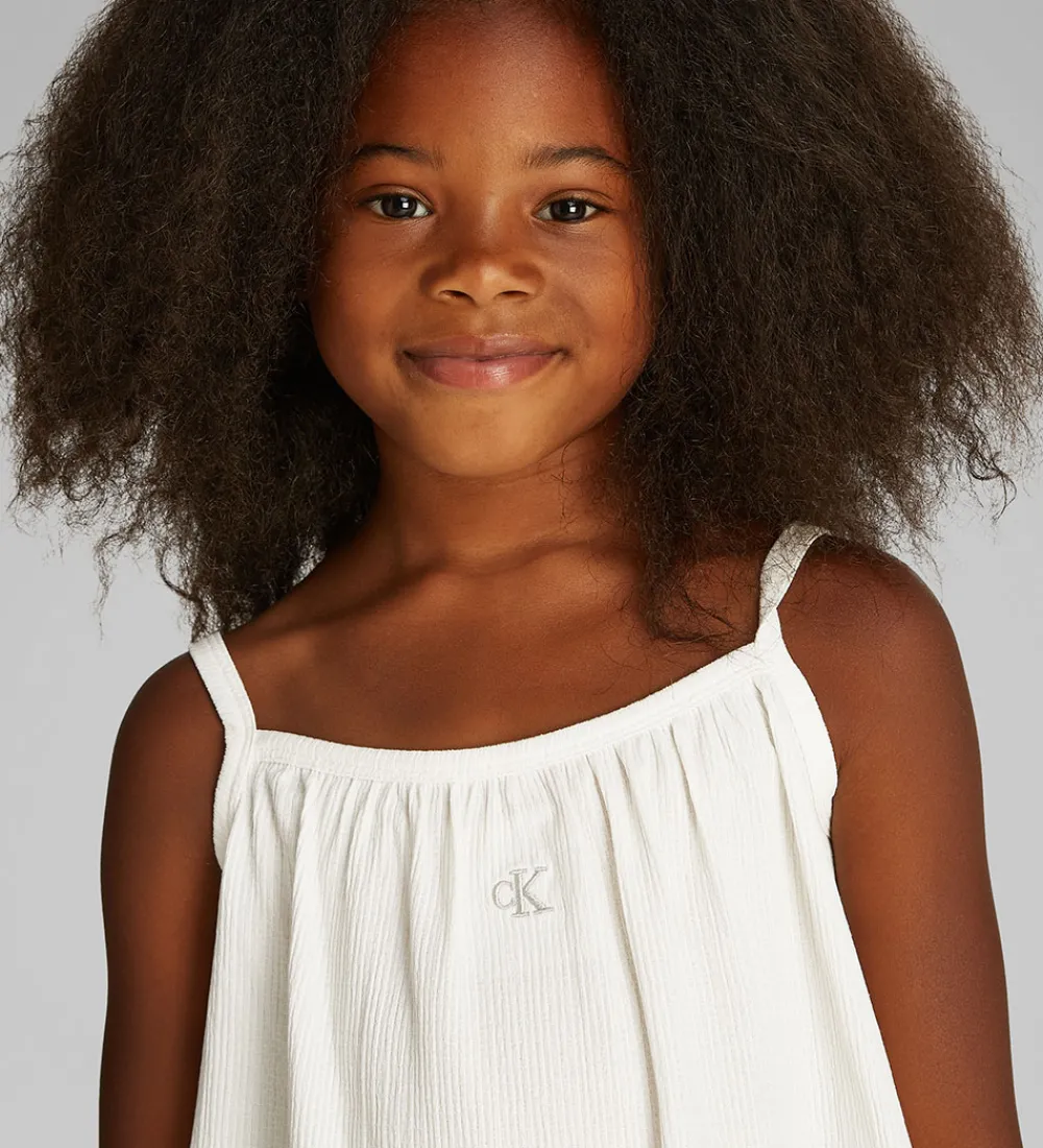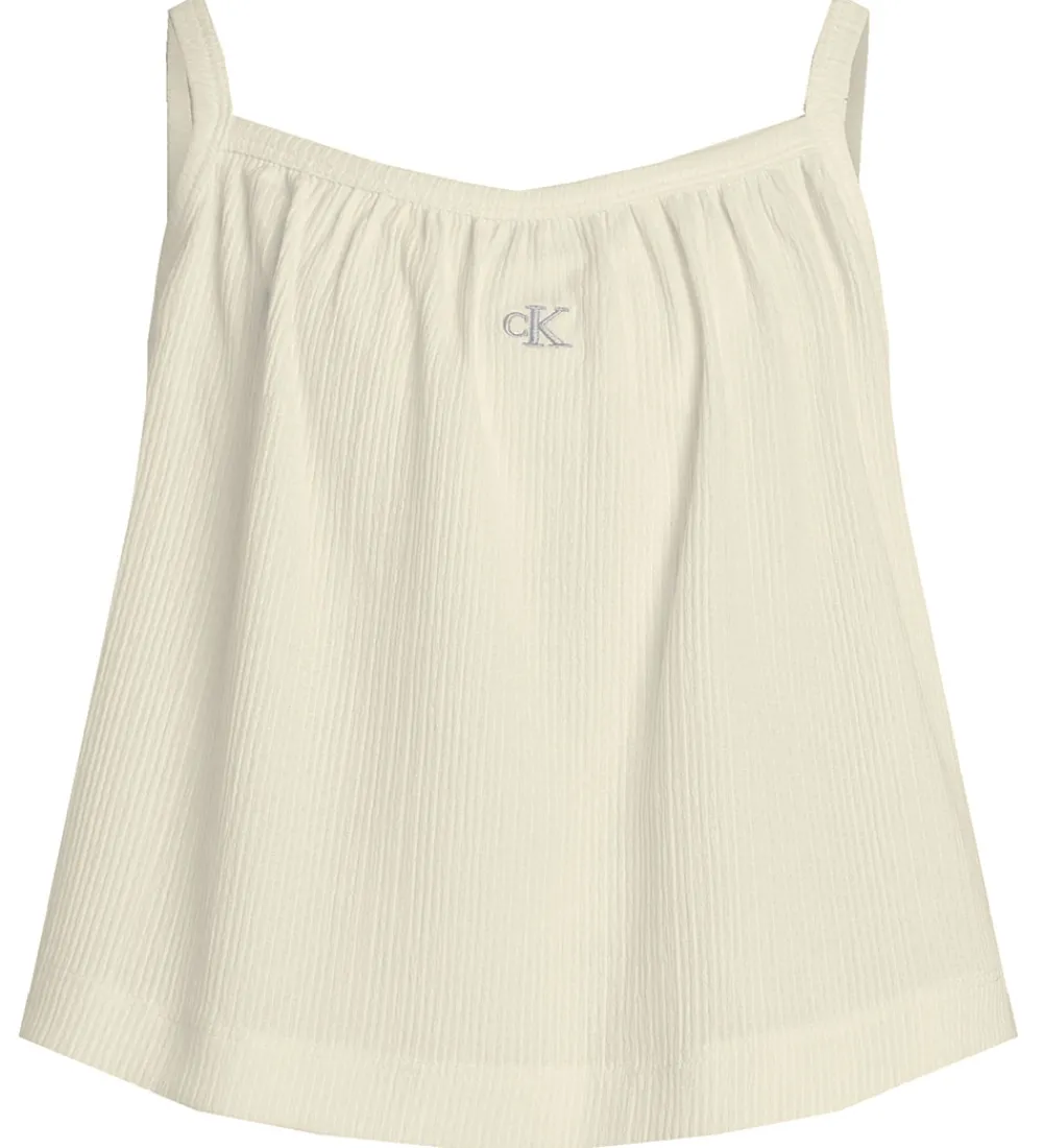 Elegant Calvin Klein top i en neutral cremefarve. Den har et enkelt design med et lille, broderet Calvin Klein logo foran. Denne top har en let struktur og tynde stropper, der giver et tidløst udtryk.