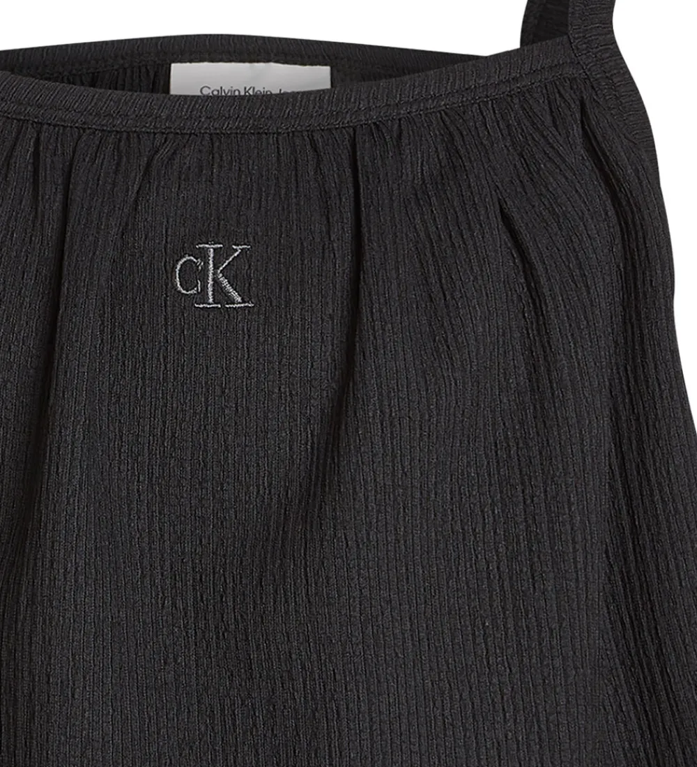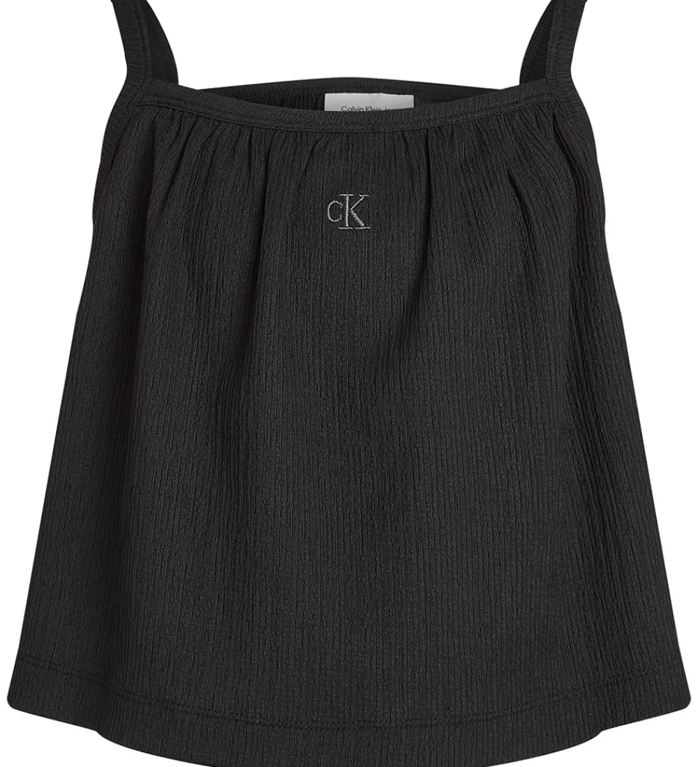 Moderne Calvin Klein top i sort med en fin struktur og et diskret logoprint foran. Denne tanktop har smalle stropper, der giver en let og luftig fornemmelse. Del af Calvin Klein’s elegante kollektion.