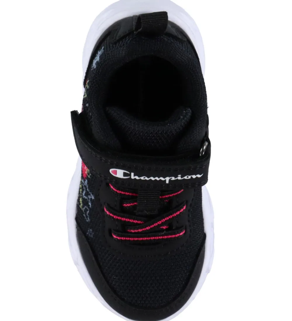 Flotte Champion sko i sort tekstil og imiteret skind med print på ydersiden af hjerter, stjerner og logo i pink, gul og blå. Skoene har indbygget LED-lys i ydersålerne, som aktiveres når man går og løber. Lyset blinker i forskellige farver.