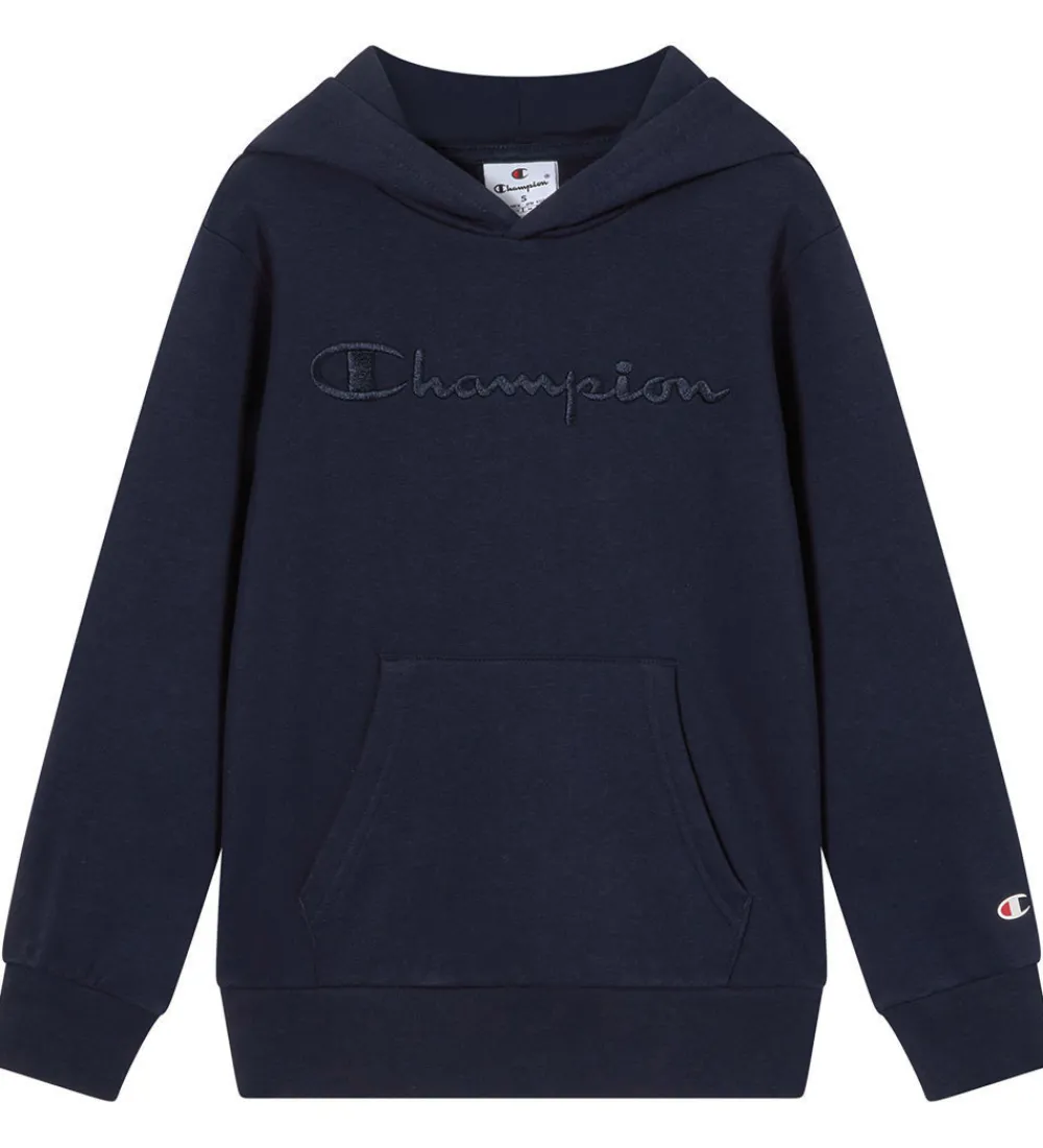 Stilfuld Champion hættetrøje i en dyb marineblå farve med et elegant, tone-i-tone broderet logo på fronten. Champion hættetrøjen har en praktisk kængurulomme og brede ribkanter ved håndleddene og forneden. Hættetrøjen har en rummelig hætte, der giver et afslappet look. Hættetrøjen har blødt, børste bomuld på indersiden.