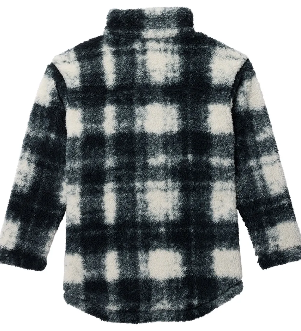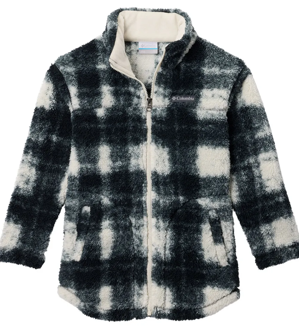 Hyggelig Columbia fleecejakke i sort- og hvidternet teddyfleece med en logopatch på venstre bryst.