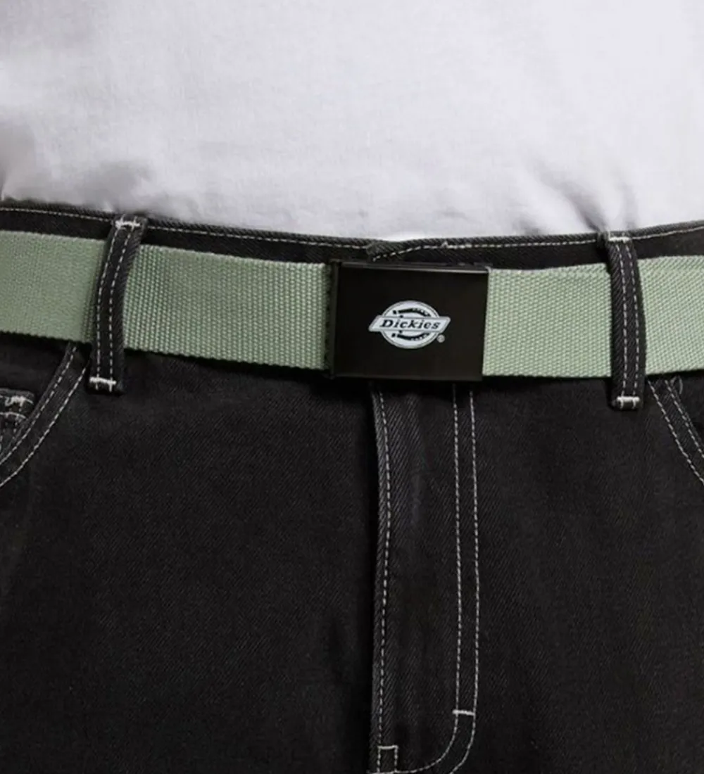 Smart Dickies bælte i grøn. Bæltespændet er sort med et hvidt logoprint. Dickies bæltet åbnes fortil med et bæltespænde i metal. Bæltet kan justeres frit, da det hodes fast med tænder.