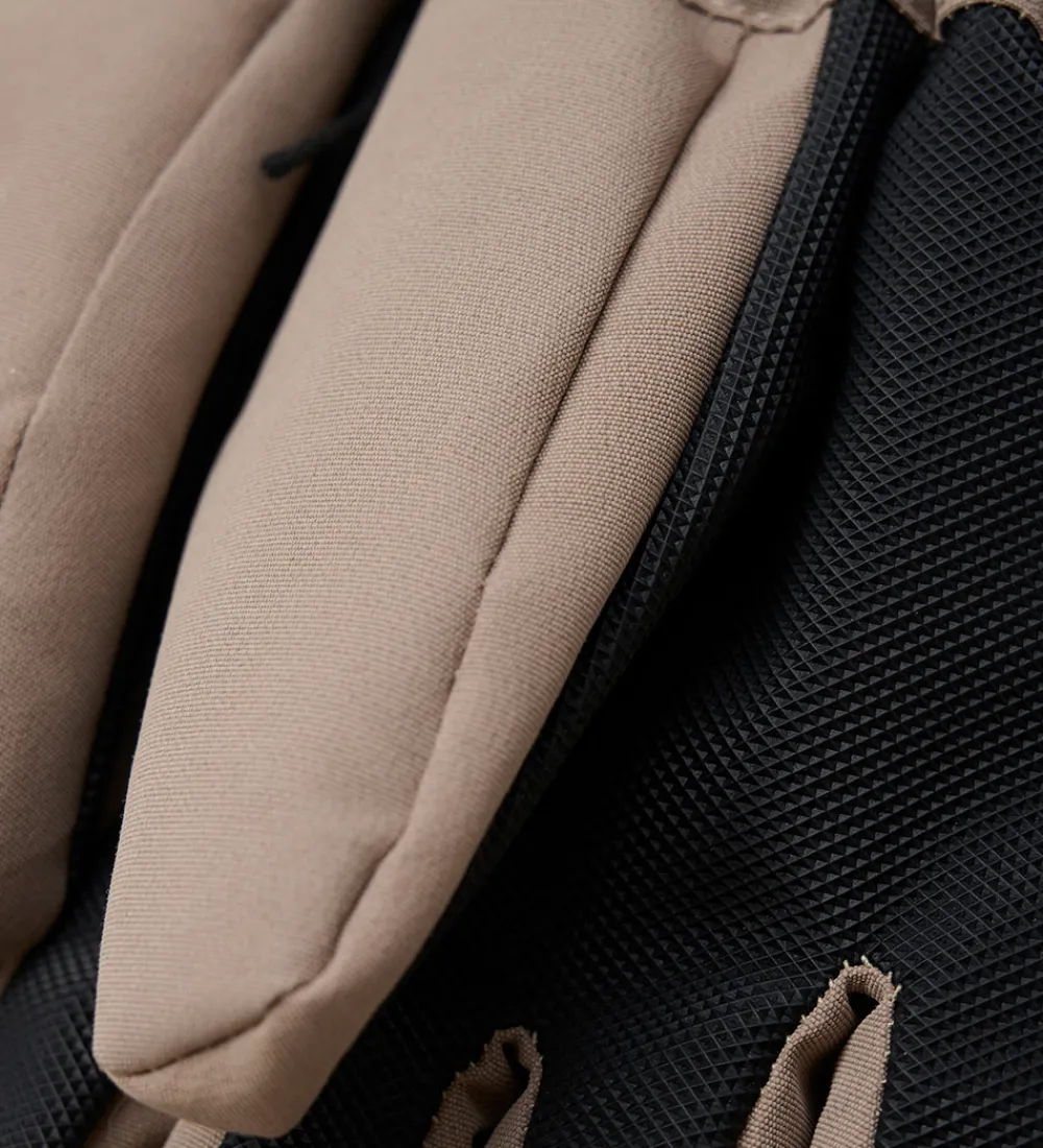 En Fant handskerne har en smal elastikkant i åbningerne samt omkring håndleddene, der kan strammes yderligere ind med en velecrorem.