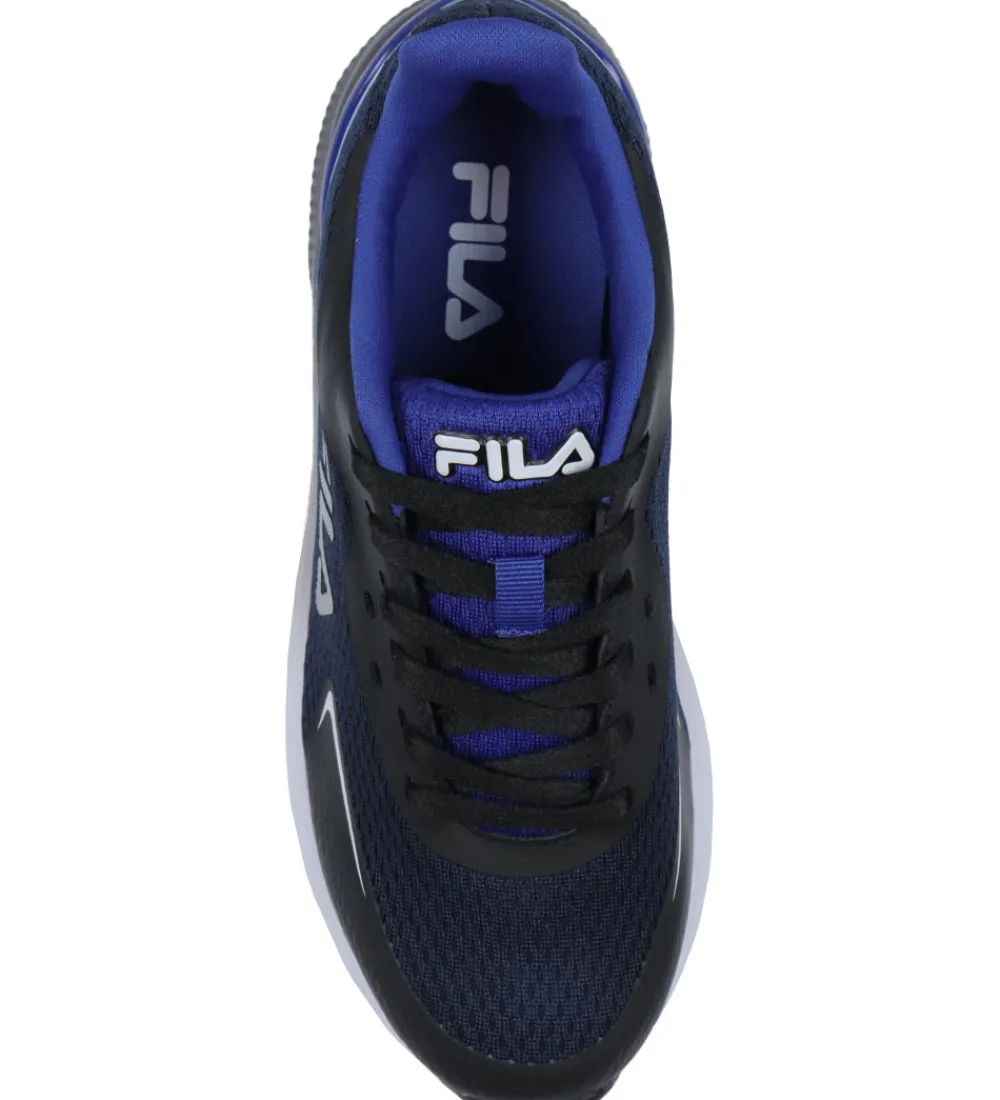 Smarte Fila sko i mørkeblåt mesh med hvide logoer og detaljer i blå og hvid. Ydersålerne graduerer i farven fra mørkegrå til hvid.