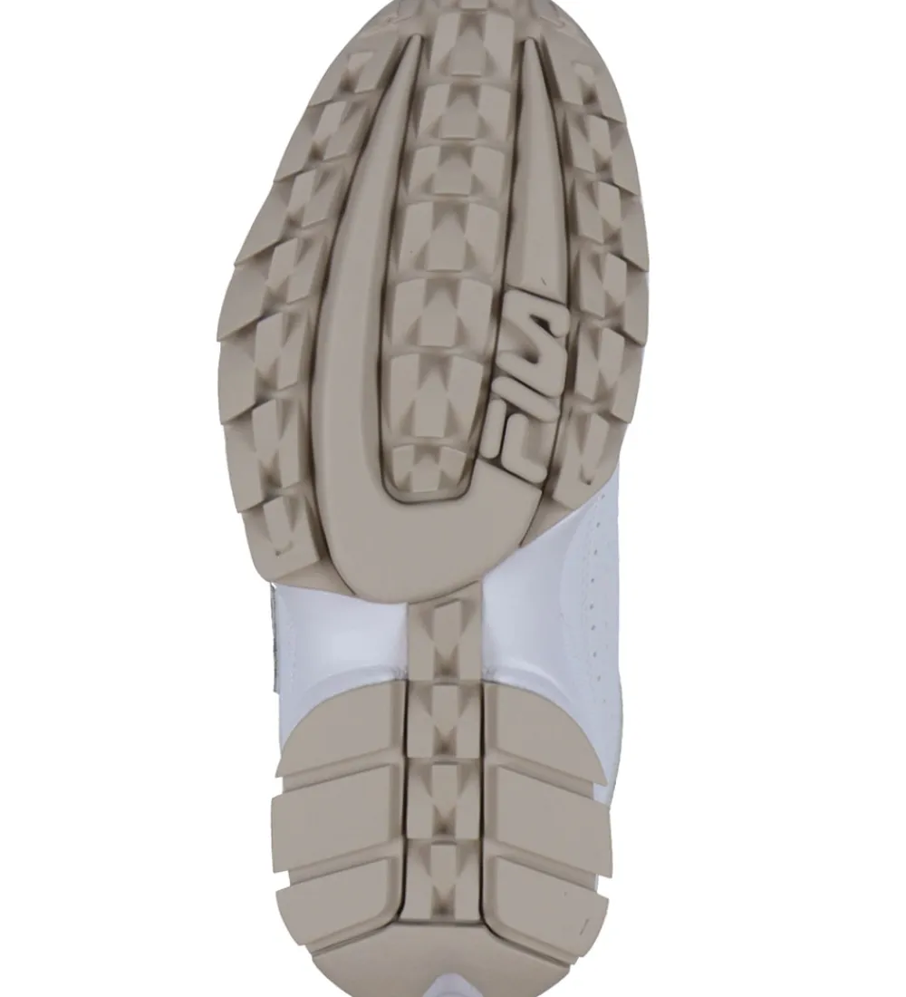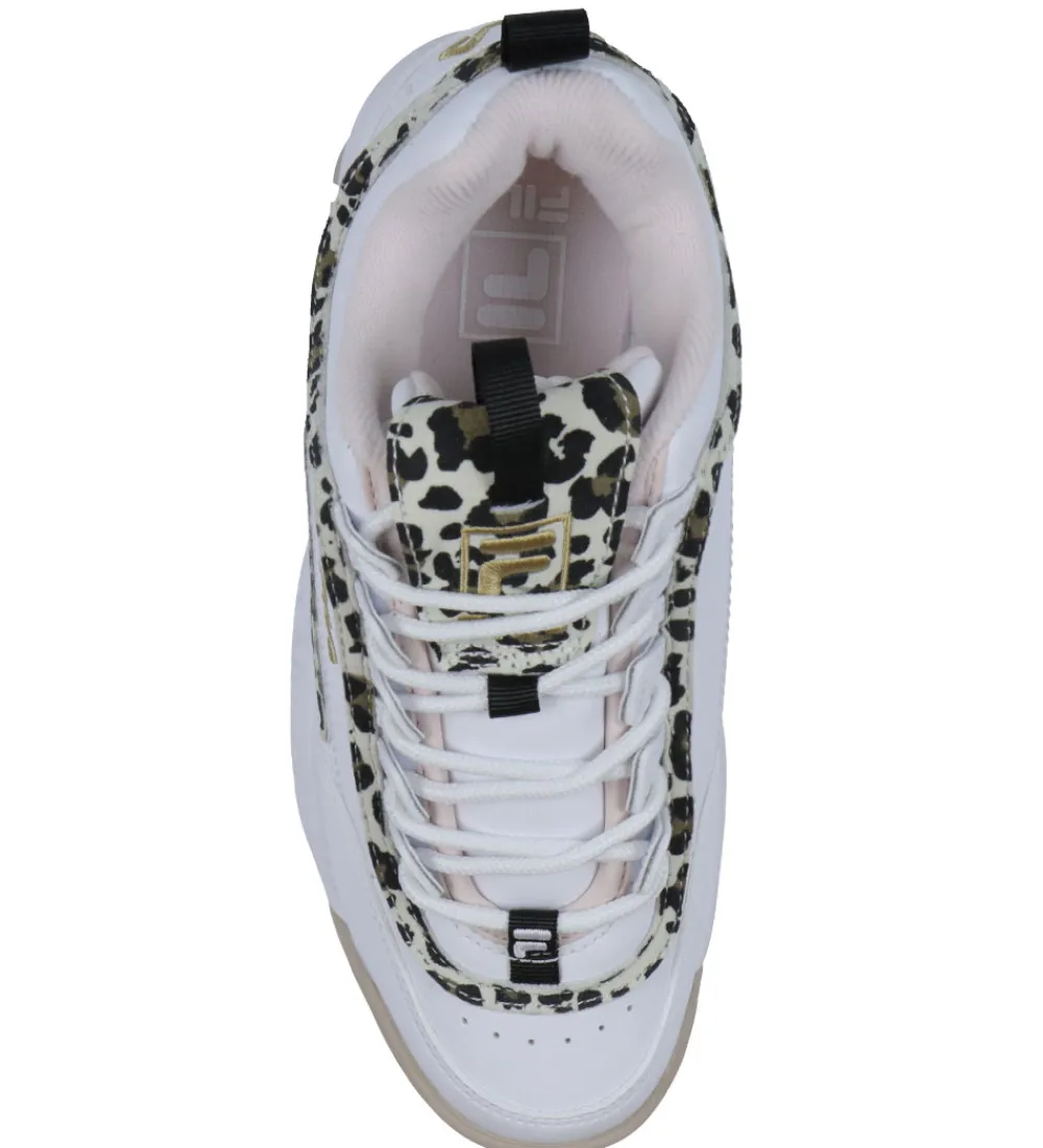 Smarte Fila sko i hvidt, imiteret skind med detaljer af cremefarvet ruskind med et leopardmønster i sort og brun.