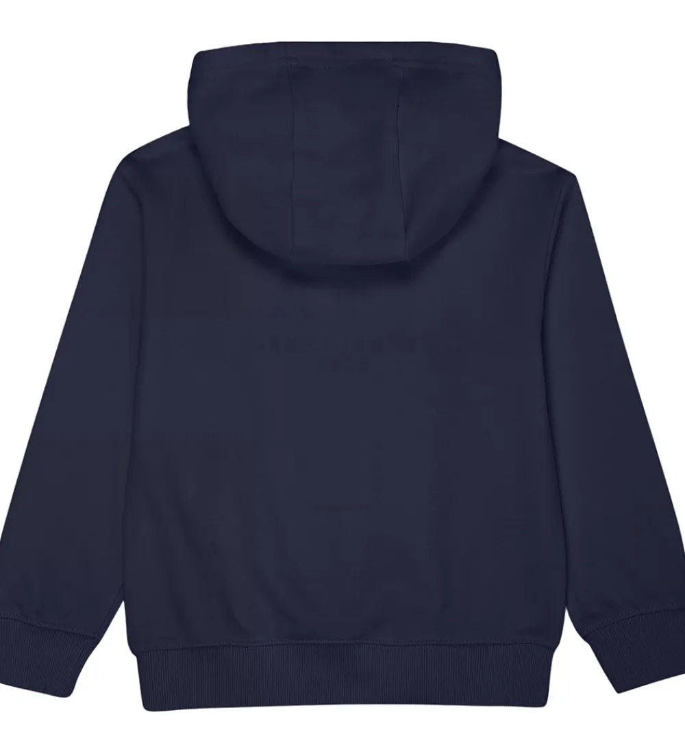 Hættetrøjen er udstyret med en rummelig kængurulomme foran, hvilket tilføjer en praktisk detalje. Ribkanter ved både ærmer og liv sikrer en god pasform.