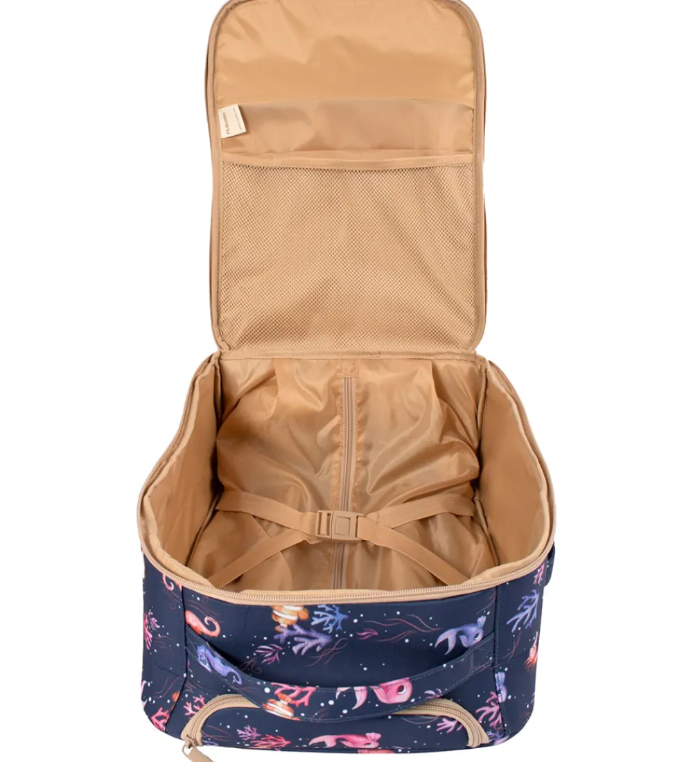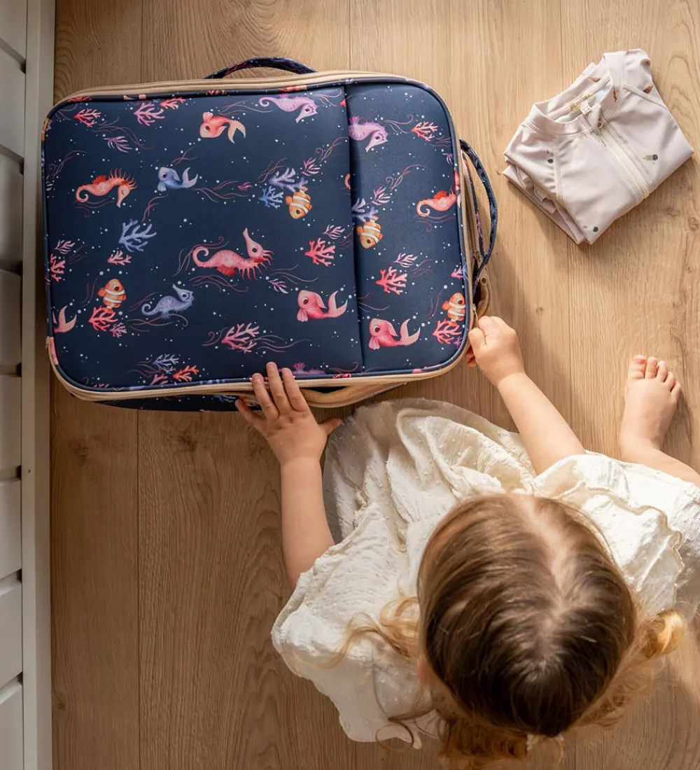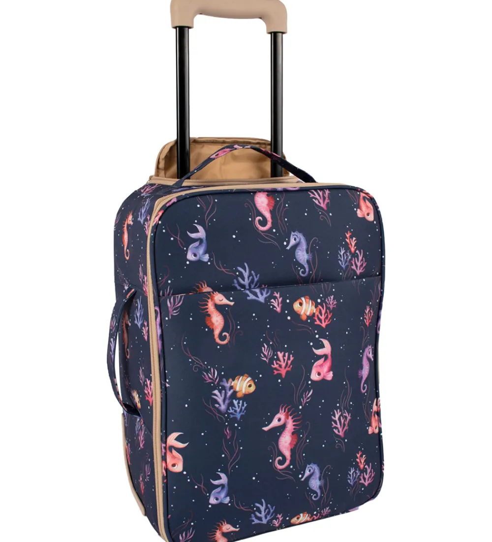 Smart Filibabba kuffert i navyblå med print af fisk, søheste og koraller i lilla, blå og rosa.