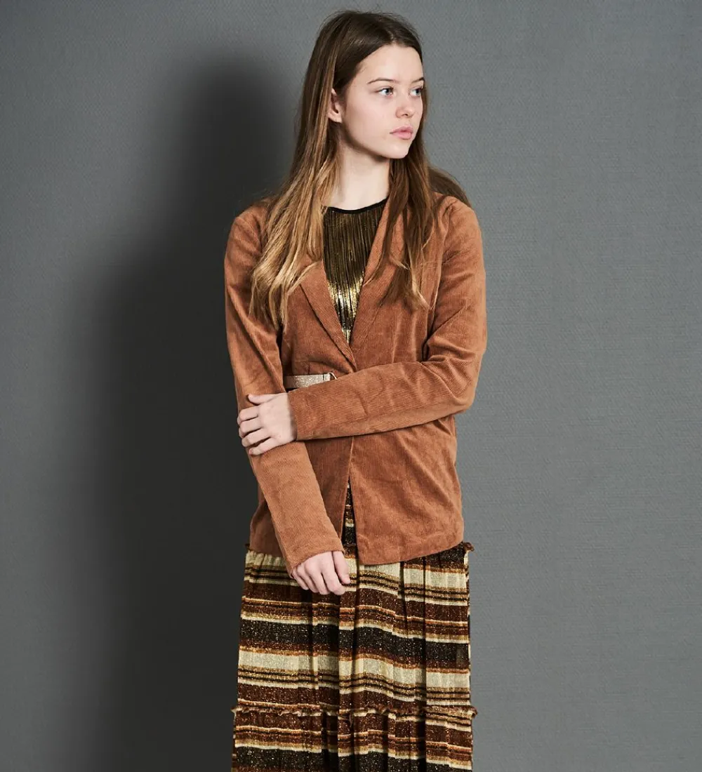 Hound blazeren har lange ærmer og en elegant klassisk krave. Blazeren lukkes på fronten med en enkelt brun knap.