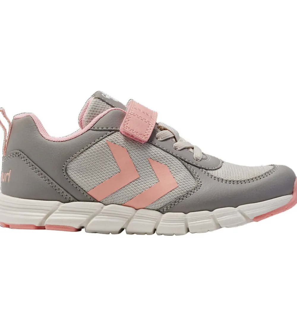Flotte Hummel sko i lysegråt mesh og mørkegråt imiteret skind. Skoene har rosa detaljer og logo på siderne.