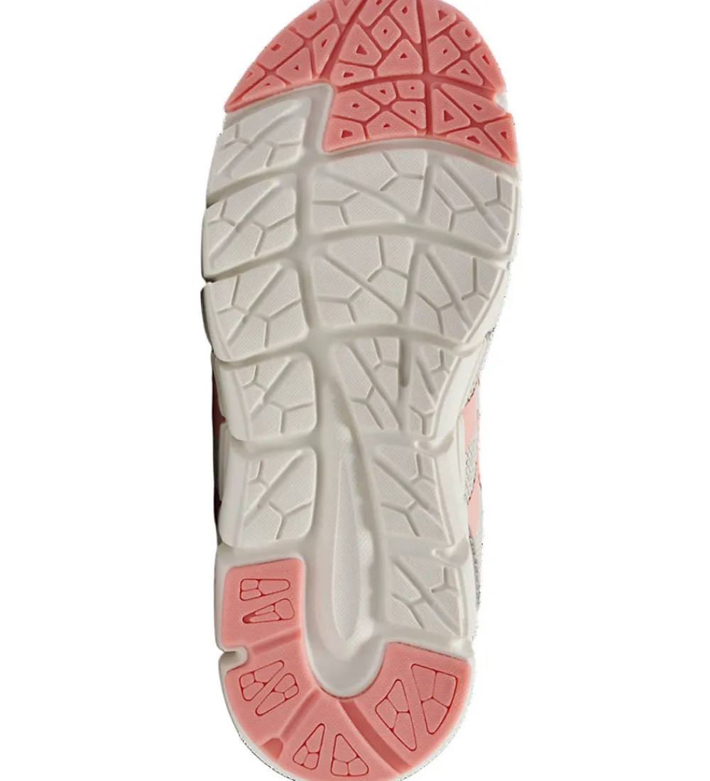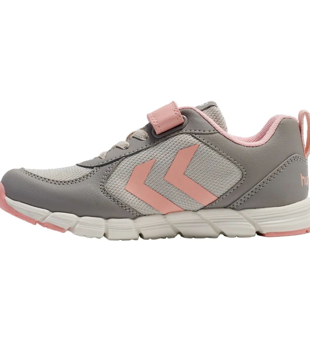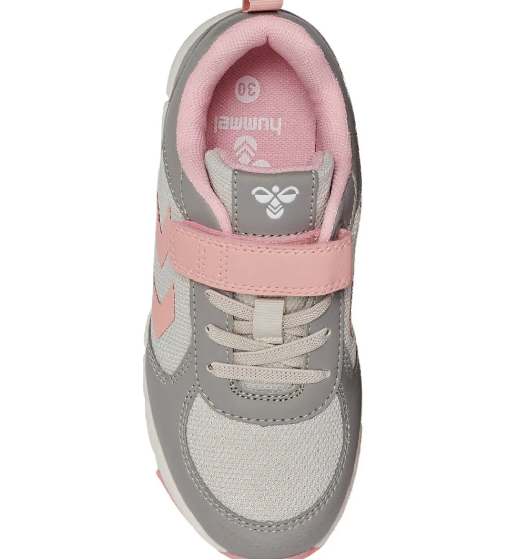 Hummel skoene har elastiksnøre over vristen og lukkes øverst med en praktisk velcrorem. Bagpå er der en strop, som gør det lettere at få skoene på. Indvendigt er der rosa tekstil med god polstring omkring åbningen og udtagelige indersåler. Skoene har fleksible og letvægtige ydersåler med et praktisk mønster under bunden, som giver et godt fodfæste.