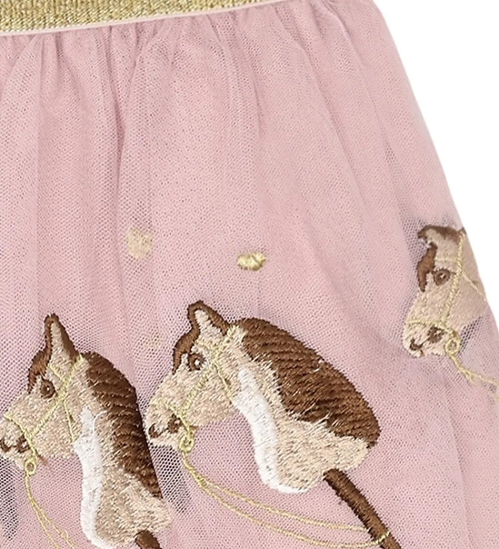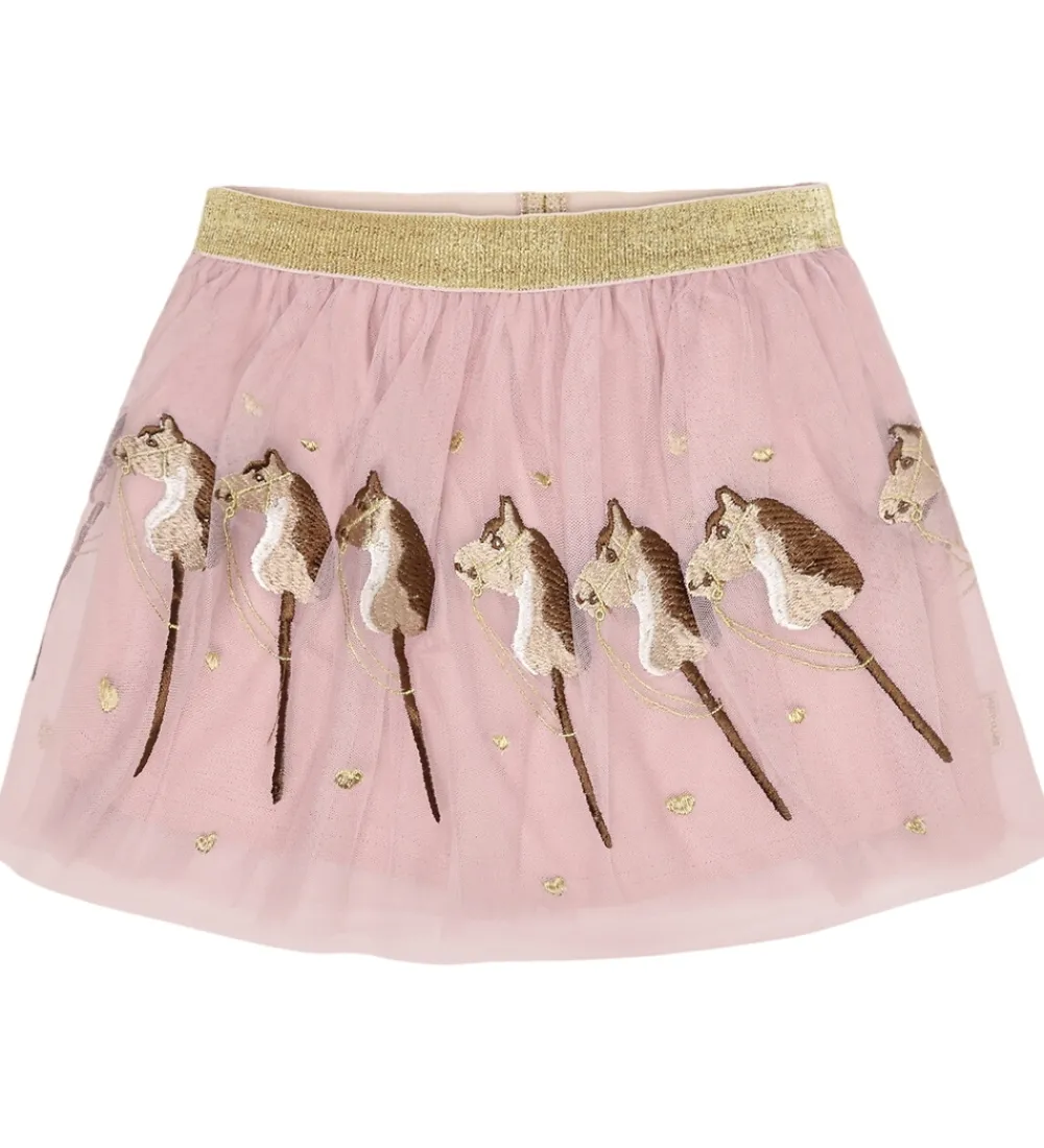 Elegant Nederdel fra Hust and Claire i lyserød tyl med broderede kæpheste. Nederdelen har en guld-elastik i taljen, som giver en god pasform. Små guldfarvede detaljer pryder stoffet og tilføjer en ekstra dimension. Indvendigt har den et blødt inderskørt af bomuld.
