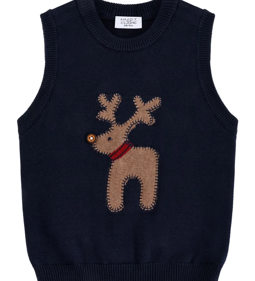 Charmerende Hust and Claire vest i en dyb marineblå nuance. Vesten har et sødt rensdyrmotiv med et detaljeret design på fronten, der tilføjer et nuttet touch. Fantastisk til små fashionistaer.