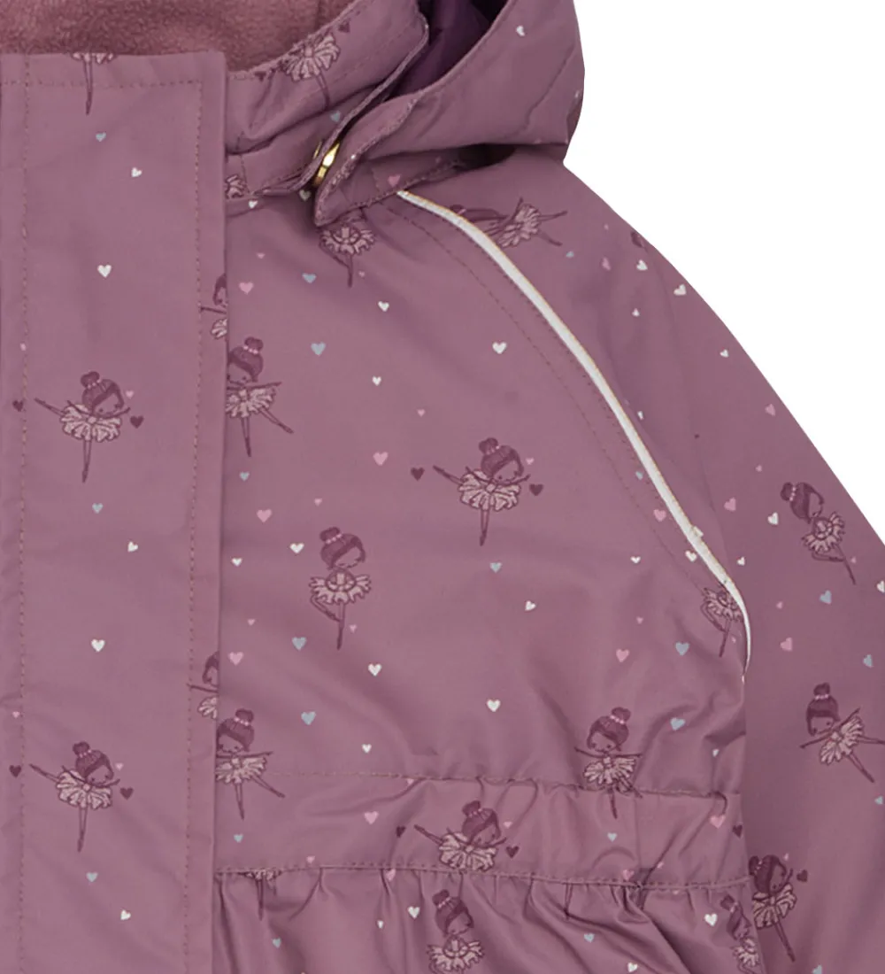 Fin Hust and Claire vinterjakke i mørk lilla med alloverprint af hjerter og ballerinaer. Vinterjakken har praktiske reflekspipings og -detaljer på velplacerede steder.