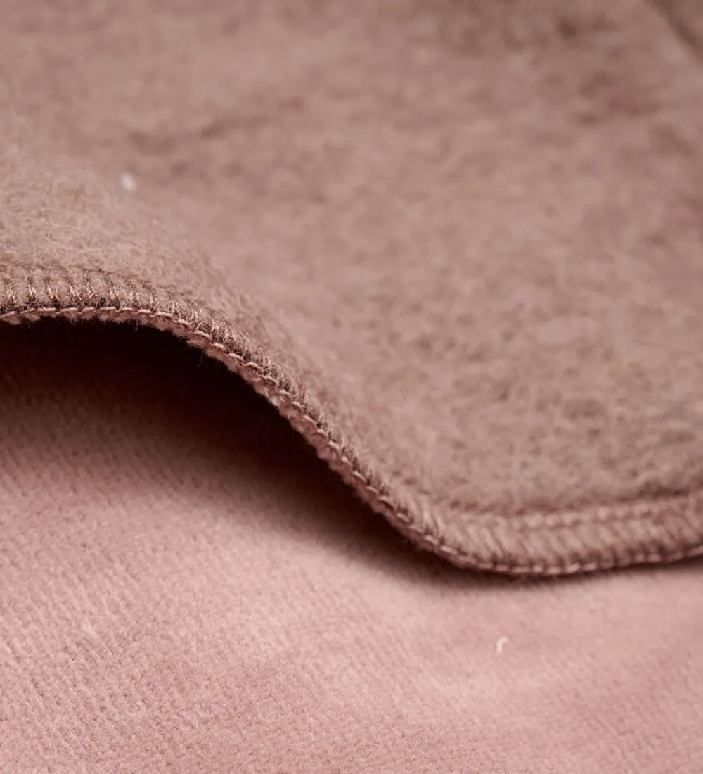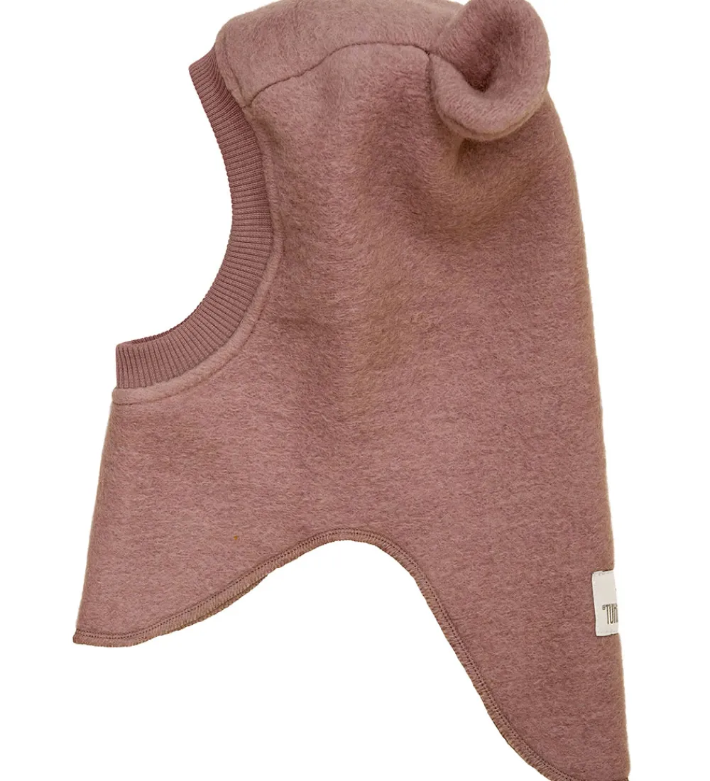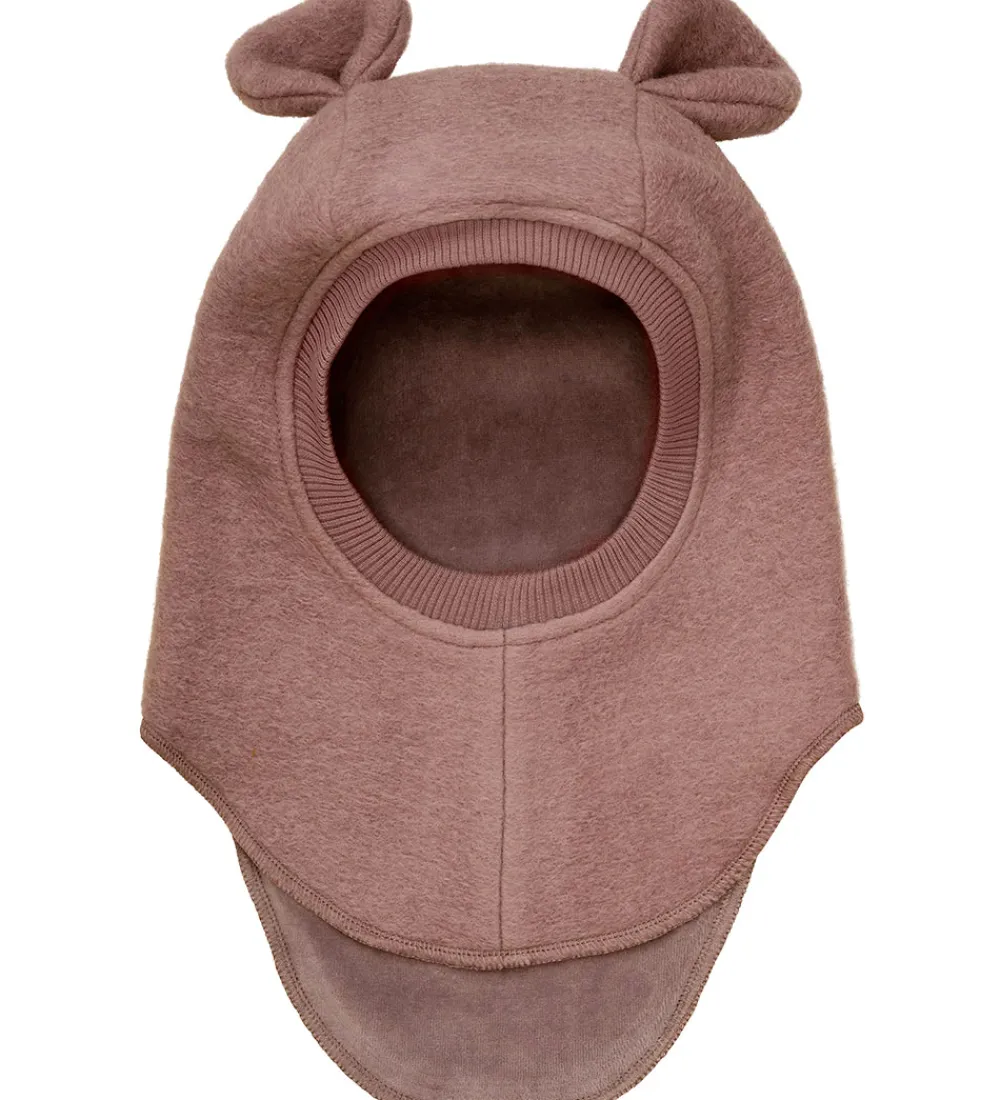 Charmerende Huttelihut elefanthue af lunt uldfleece i støvet rosa med rund hovedform. Huttelihut elefanthuen er lavet af to lag med søde ører på toppen. Ribkant ved ansigtet giver god pasform, og split-effekten forneden sikrer optimal dækning.