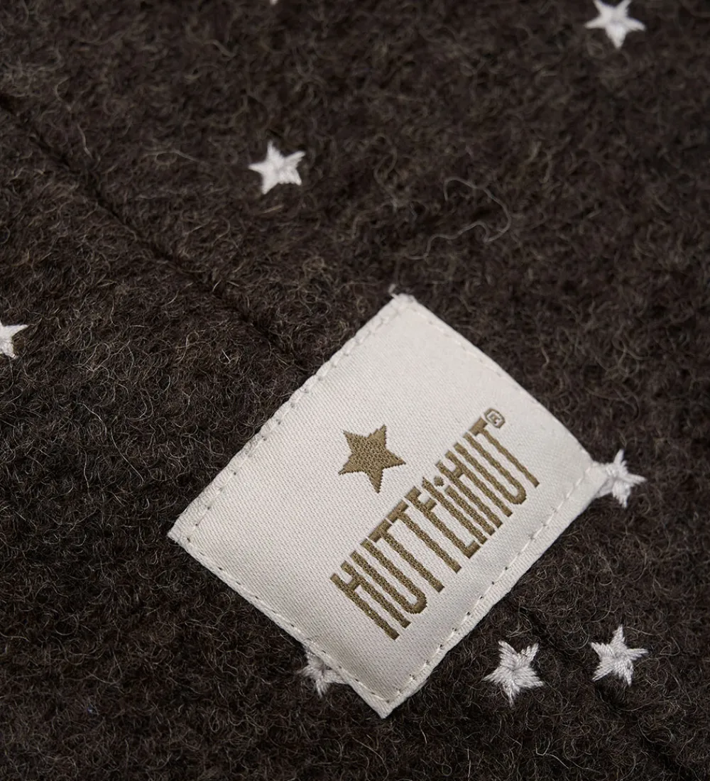 Praktisk Huttelihut elefanthue af lunt uldfleece i en meleret mørkebrun med hvide stjerner. Huttelihut elefanthuen består af to lag og har en spids hovedform med en split-effekt i bunden.