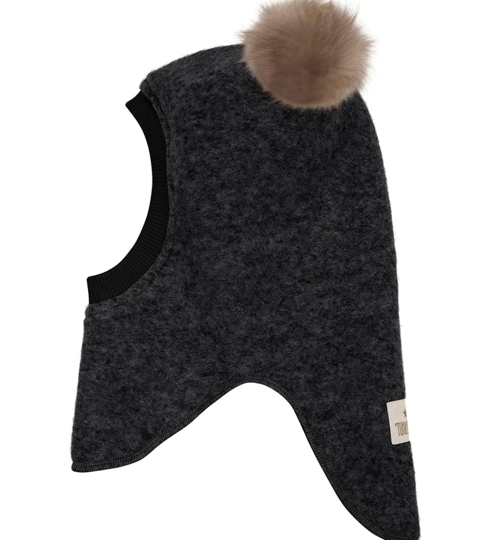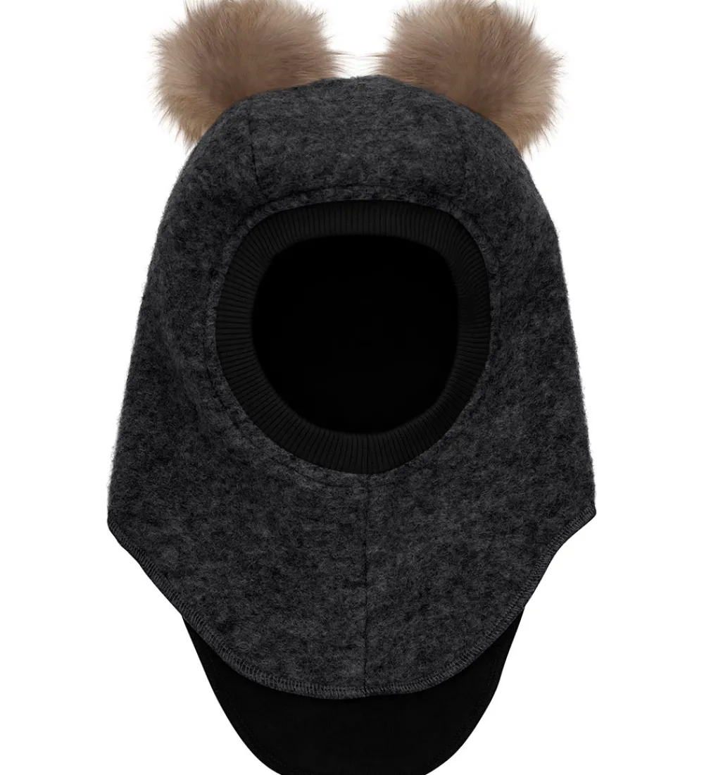 Smart Huttelihut elefanthue i en mørkegråmeleret med en blød tekstur. Huttelihut elefanthuen består af to lag og har en rund hovedform med fine kvaste af blødt alpakkapels på toppen.