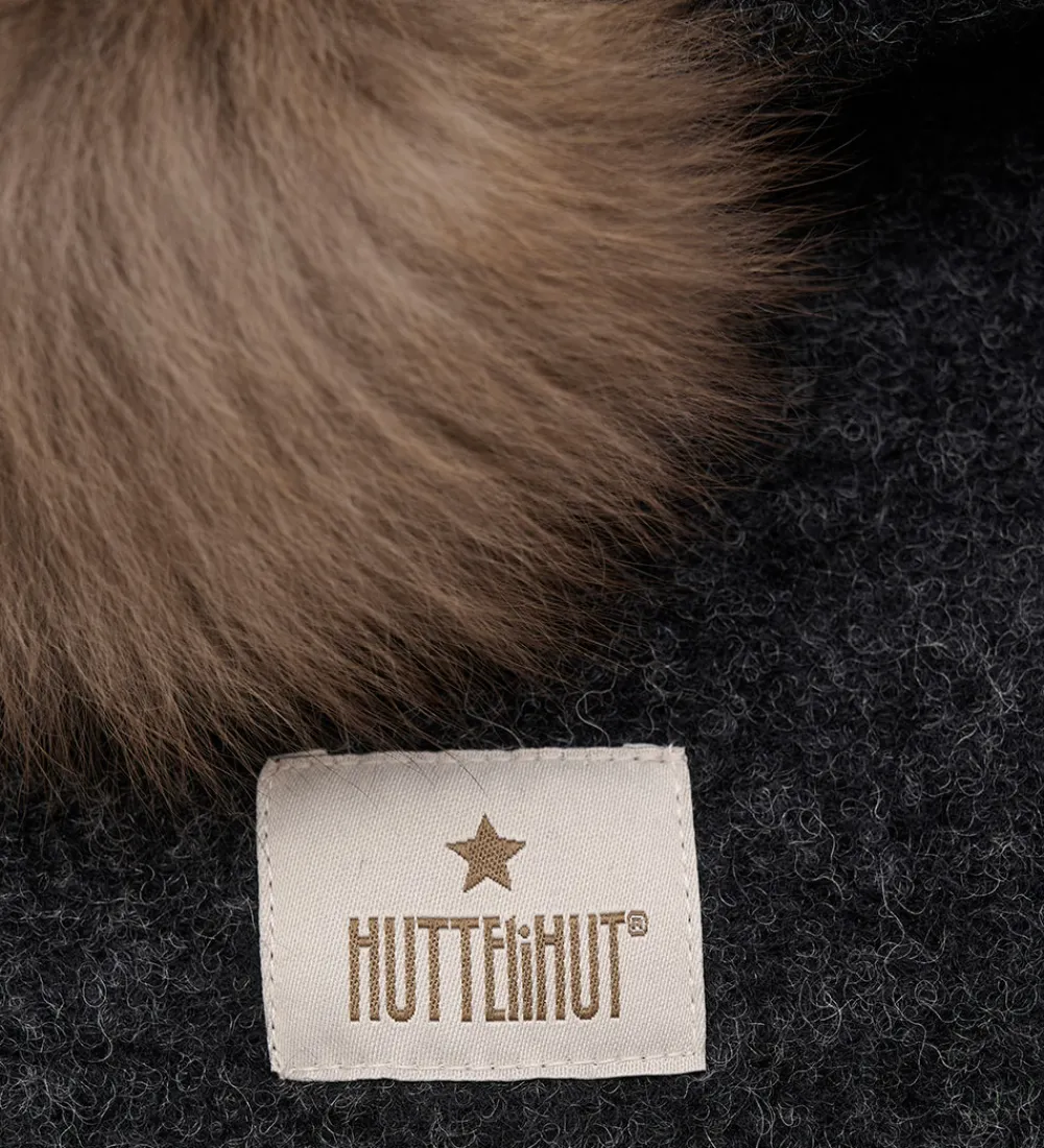 Huttelihut elefanthuen har en yderside af merinould og polyester samt en inderside af blødt velour.