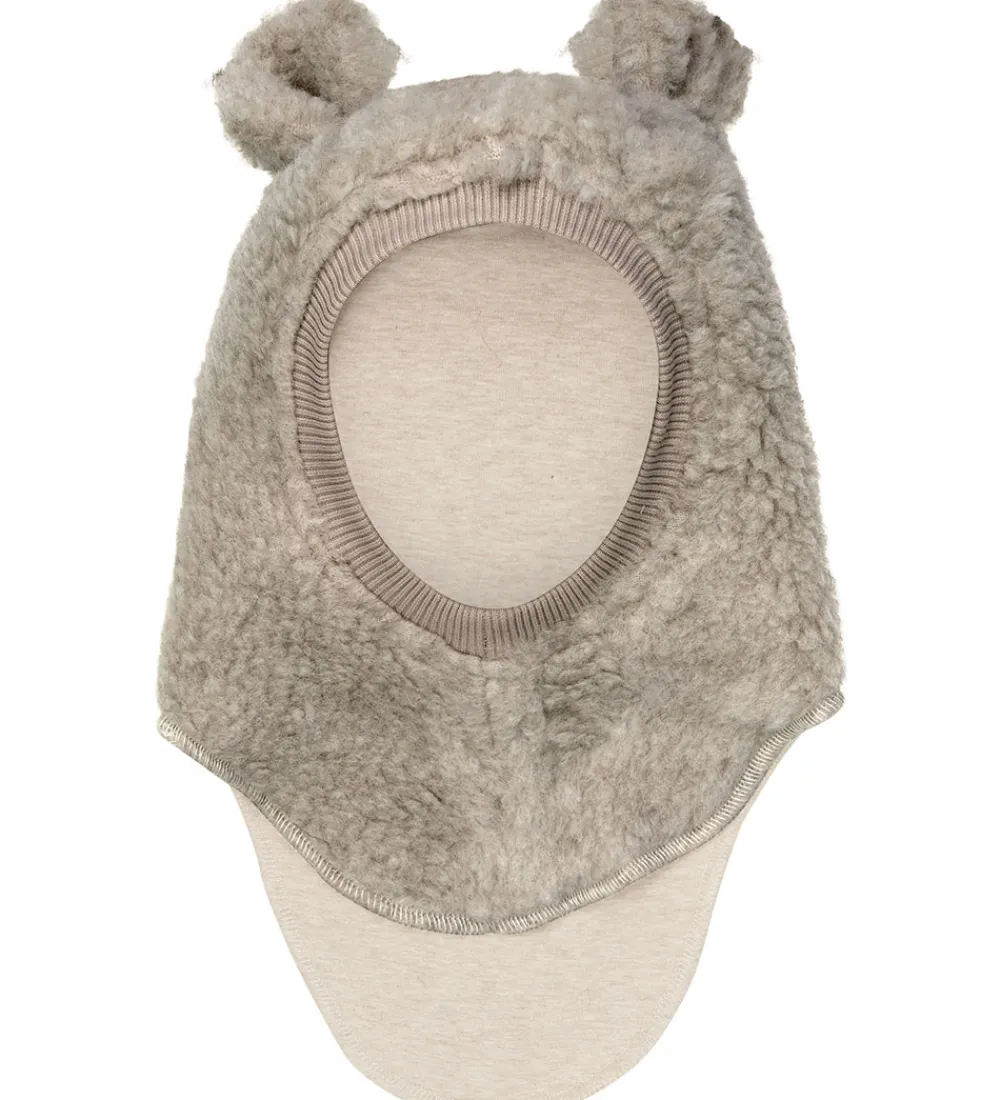 Elegant Huttelihut elefanthue i en meleret, gråbrun nuance af varmt teddyfleece. Huttelihut elefanthuen består af to lag og har en rund hovedform med små ører på toppen.