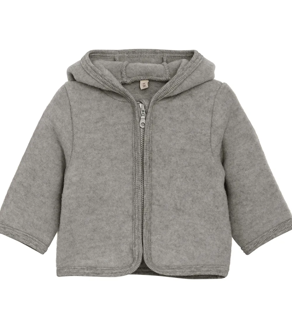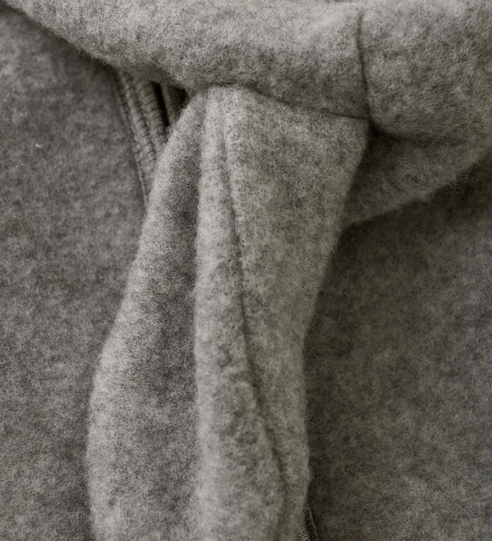 Praktisk Huttelihut fleecejakke af lunt uldfleece i meleret grå. I nakken er der en logopatch.