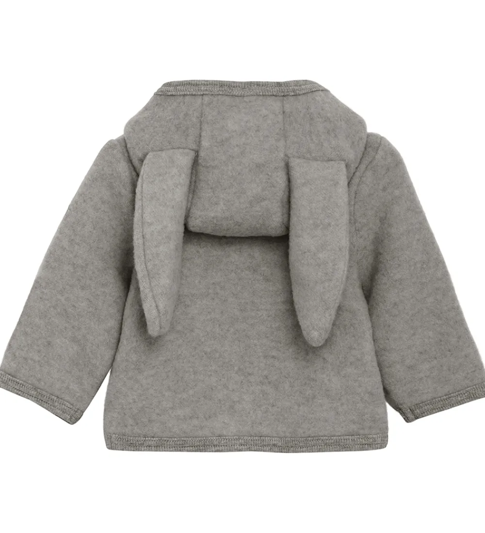 Huttelihut fleecejakken har en fast hætte med lange kaninører. Den har lange ærmer og smalle, bløde ribkanter i alle åbninger. Fleecejakken åbnes fortil ved hjælp af en gennemgående, skjult lynslås med hagebeskytter og indvendig vindstolpe.