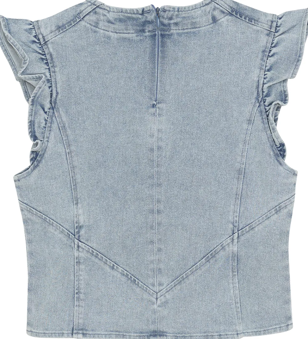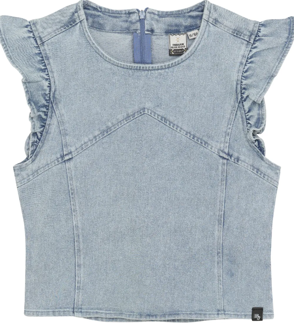 Sød Indian Blue Jeans top i en lys denimblå farve med fine syningsdetaljer. Toppen har brede skulderstropper med flæser ved skuldrene. Den har en rund halsudskæring med en diskret lynlås i nakken, så den er let at få over hovedet.