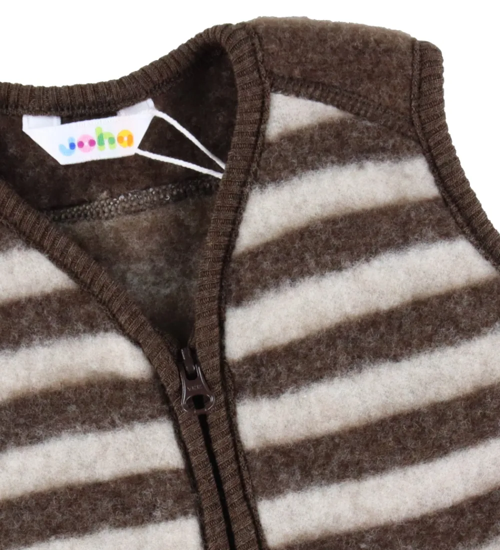 Joha vesten har brede skulderstropper, og den har en V-hals. Vesten har smalle ribkanter i alle åbningerne, og åbnes med lynlås på fronten. Vesten er fremstillet i en dejlig, blød uldkvalitet med en børstet inderside og yderside.